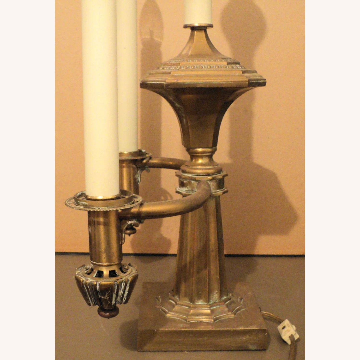 Seller’s Notes: Antique French Bouillotte Brass Table Lamp. Overall good condition commensurate with age and use. Can use a polishing. Looks like it’s missing some sort of element that screws on the two candle arms. Also missing the little knob to turn on the light at the top. See pics. At the bottom of the two candle arms are knobs that turn on the smaller flame lights. They work fine but the light bulbs themselves are out. It’s solid brass, weighing around 13 pounds.