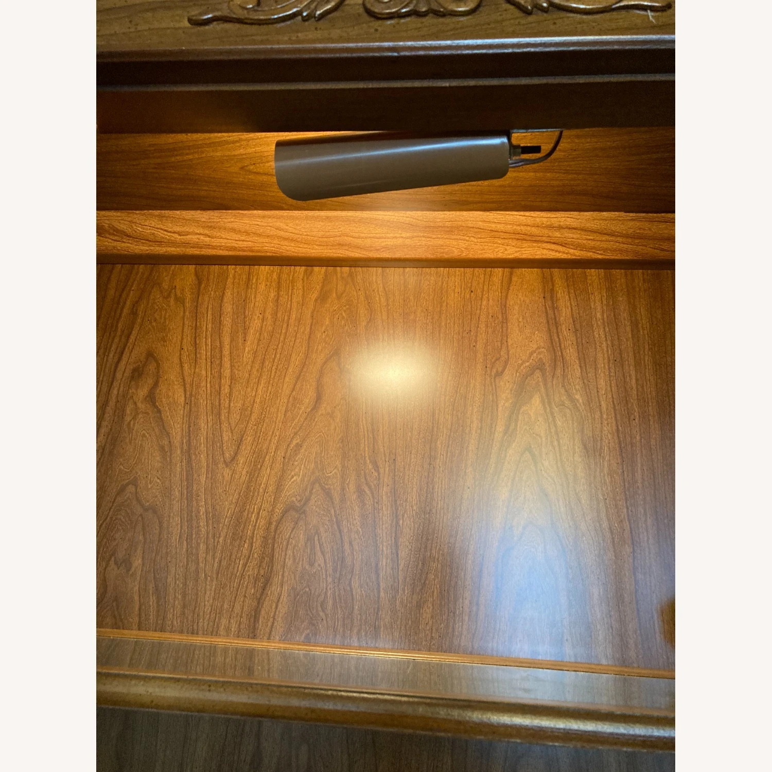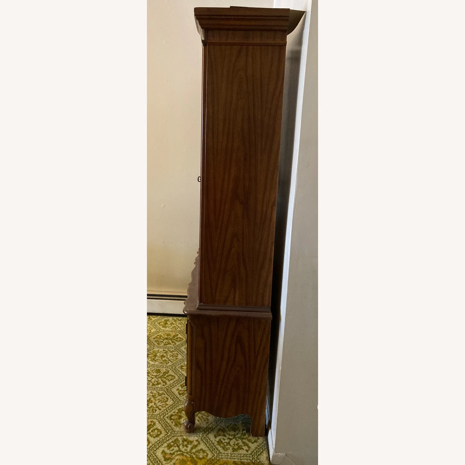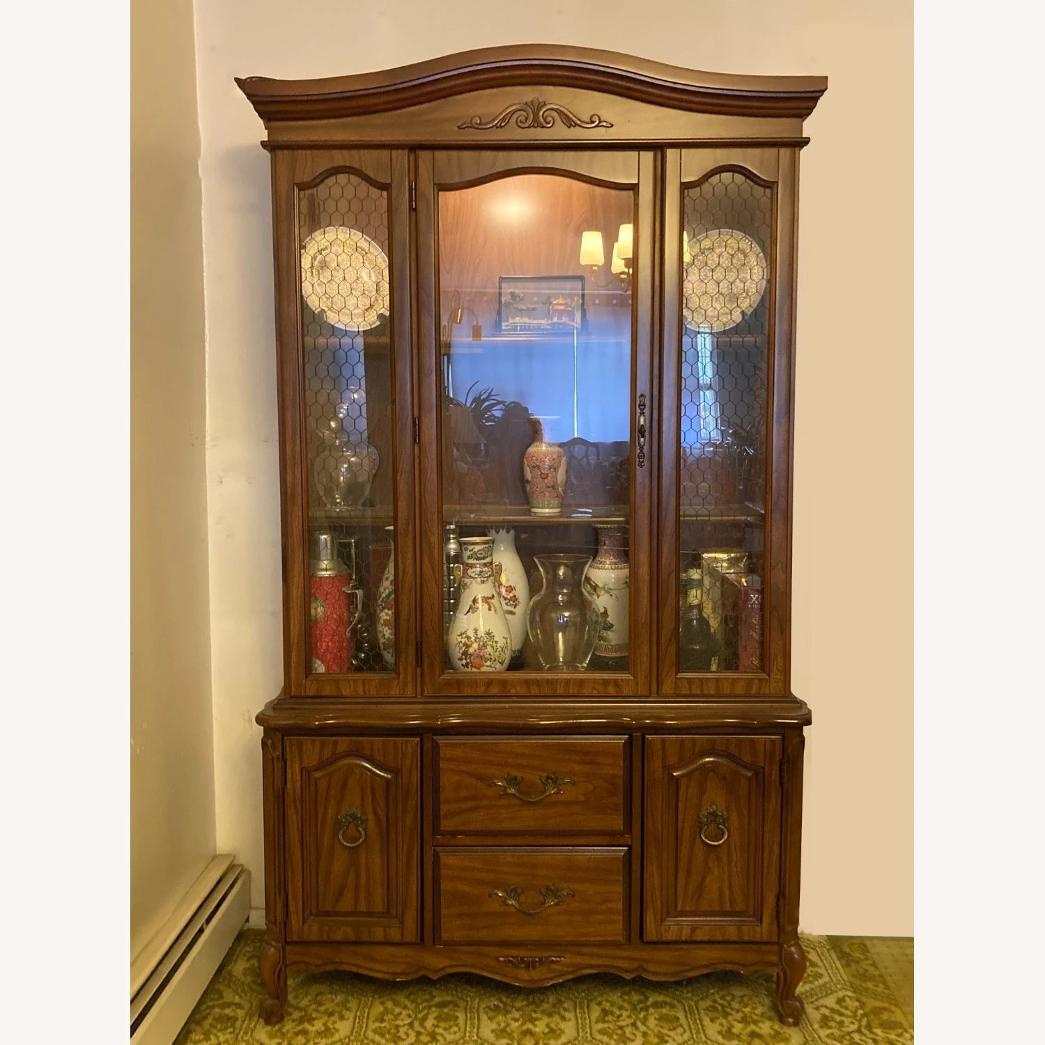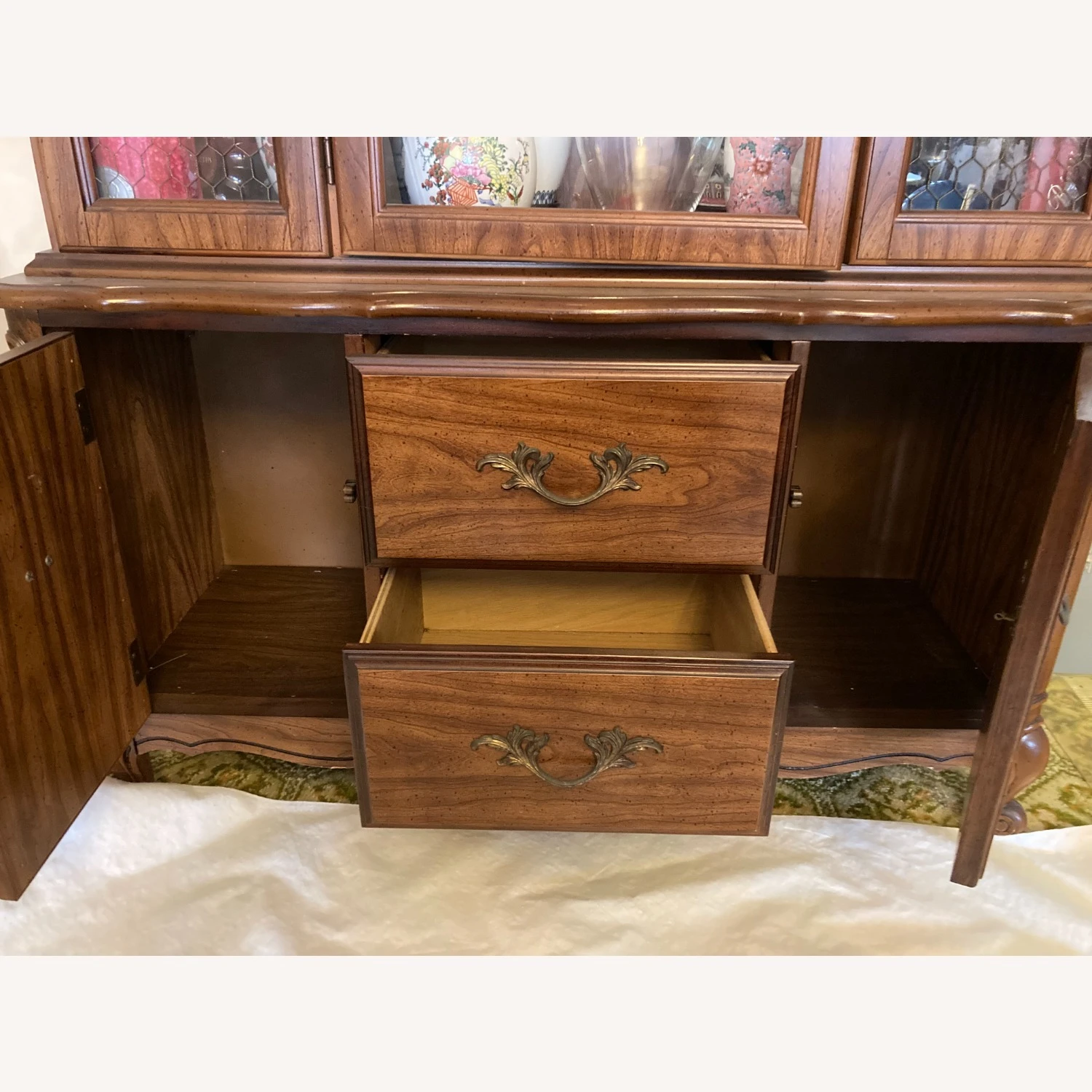 Seller’s Notes: Solid wood Bassett China Cabinet with glass side panels and glass door. Three glass shelving and hidden display light (electric cord at the back). Bottom storage consists of two drawers (inside 14.5 w x 12.5 d x 6.25 h each) and two cabinet doors (inside 12w x 14 d x 18h). Some minor surface scratches mainly at the bottom that can be retouched. A solid, classic piece to showcase your treasures.