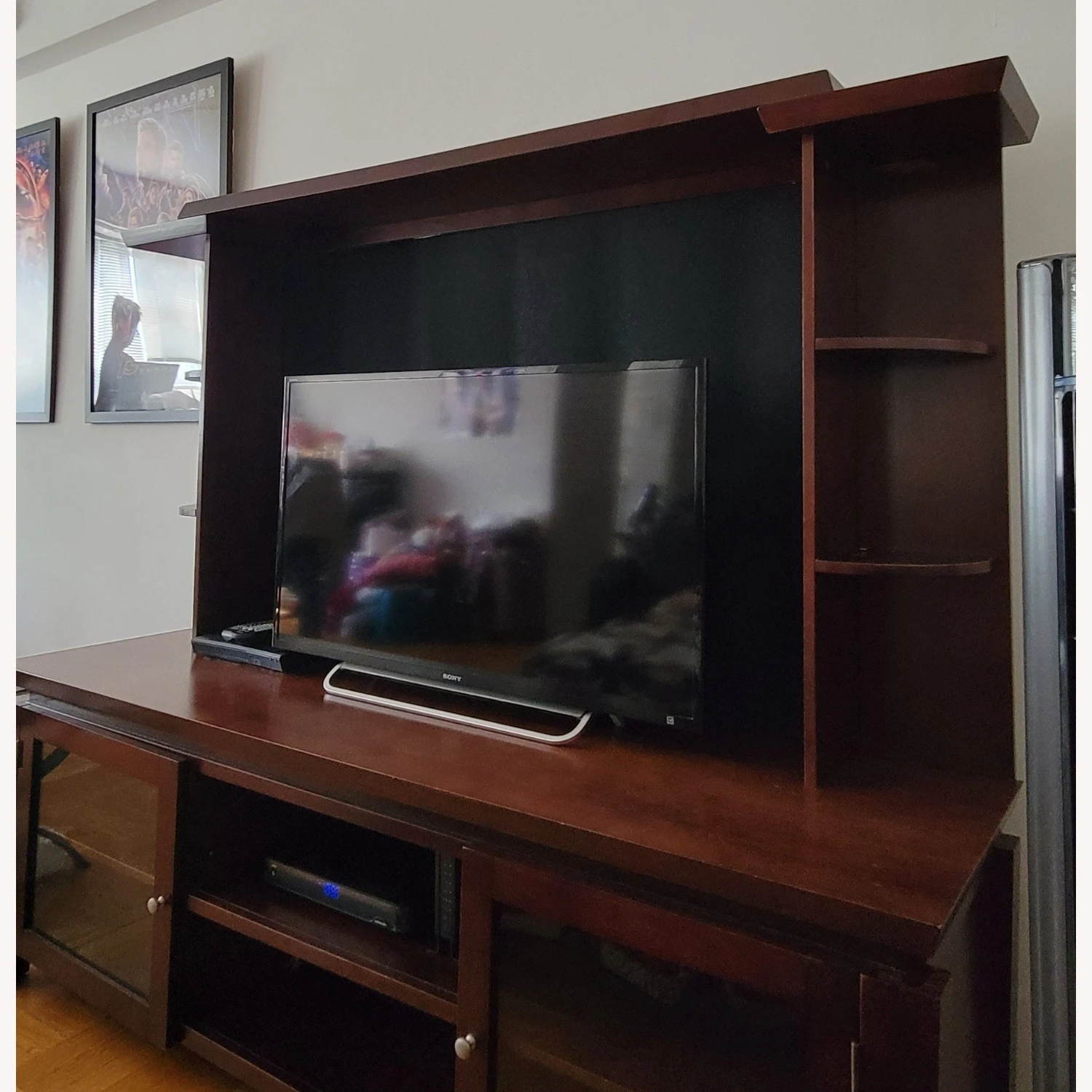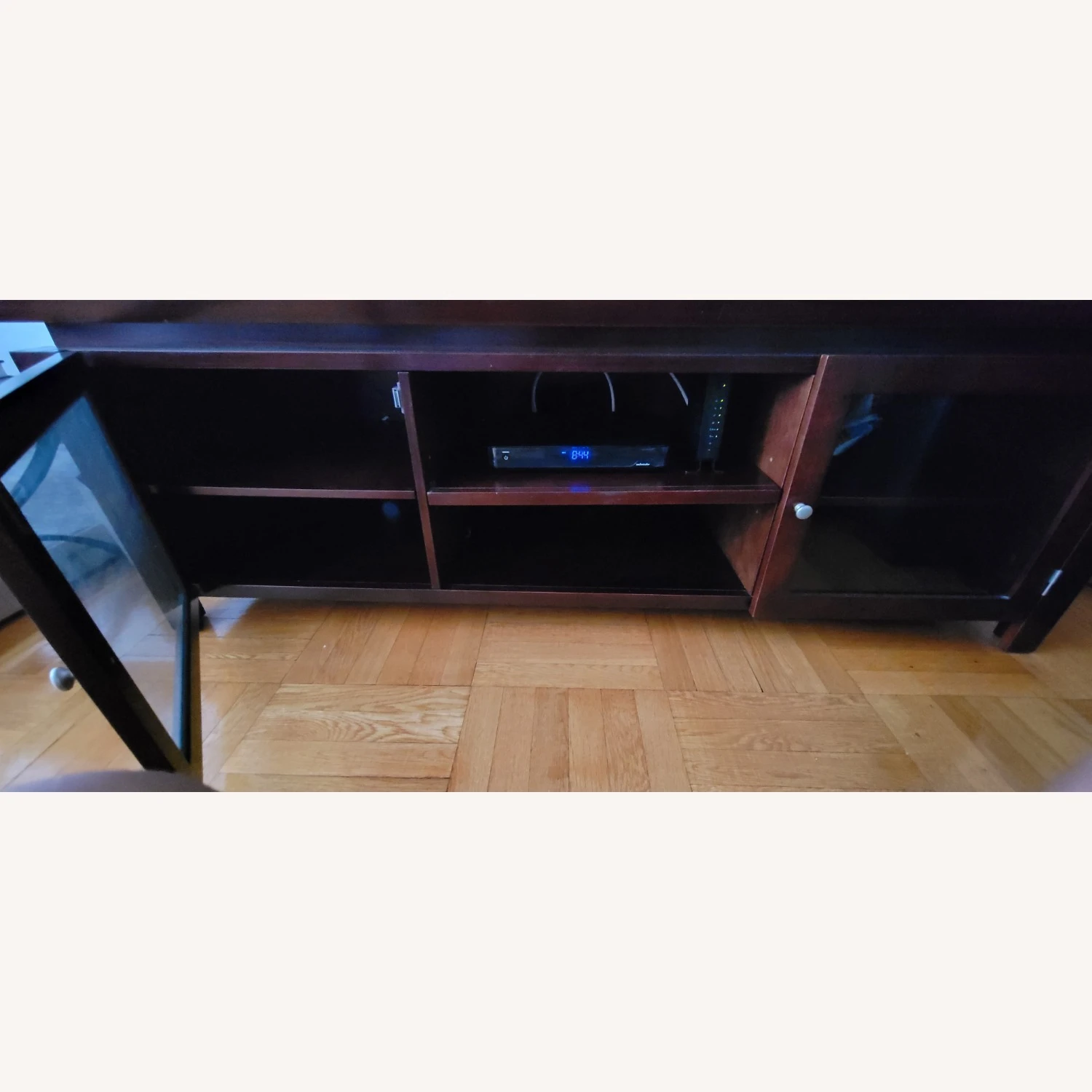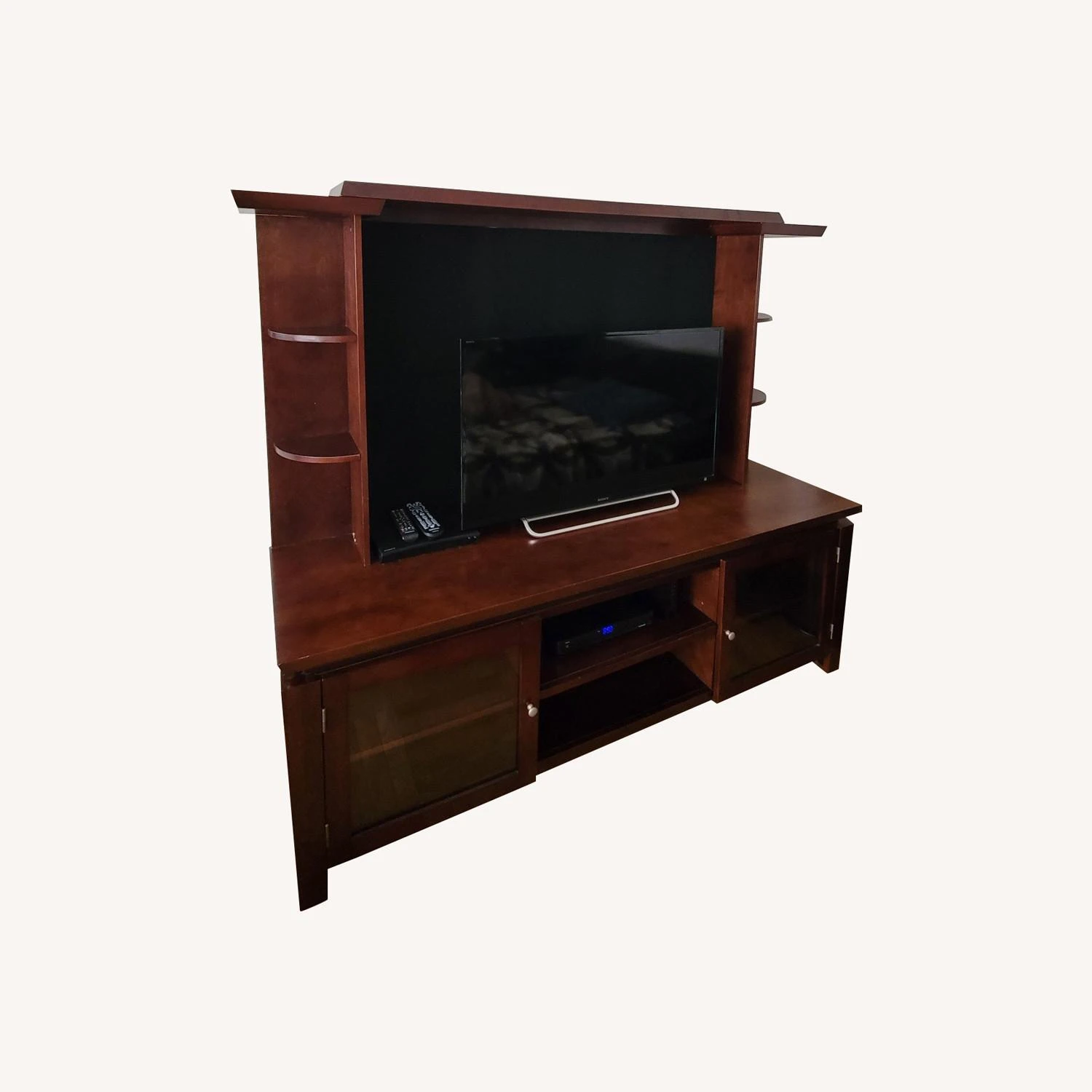 Seller’s Notes: Gently used living room furniture stand. This item can hold many showpieces and has ample storage room! Durable wooden material. Please note tv, dvd player and dvd box not included.