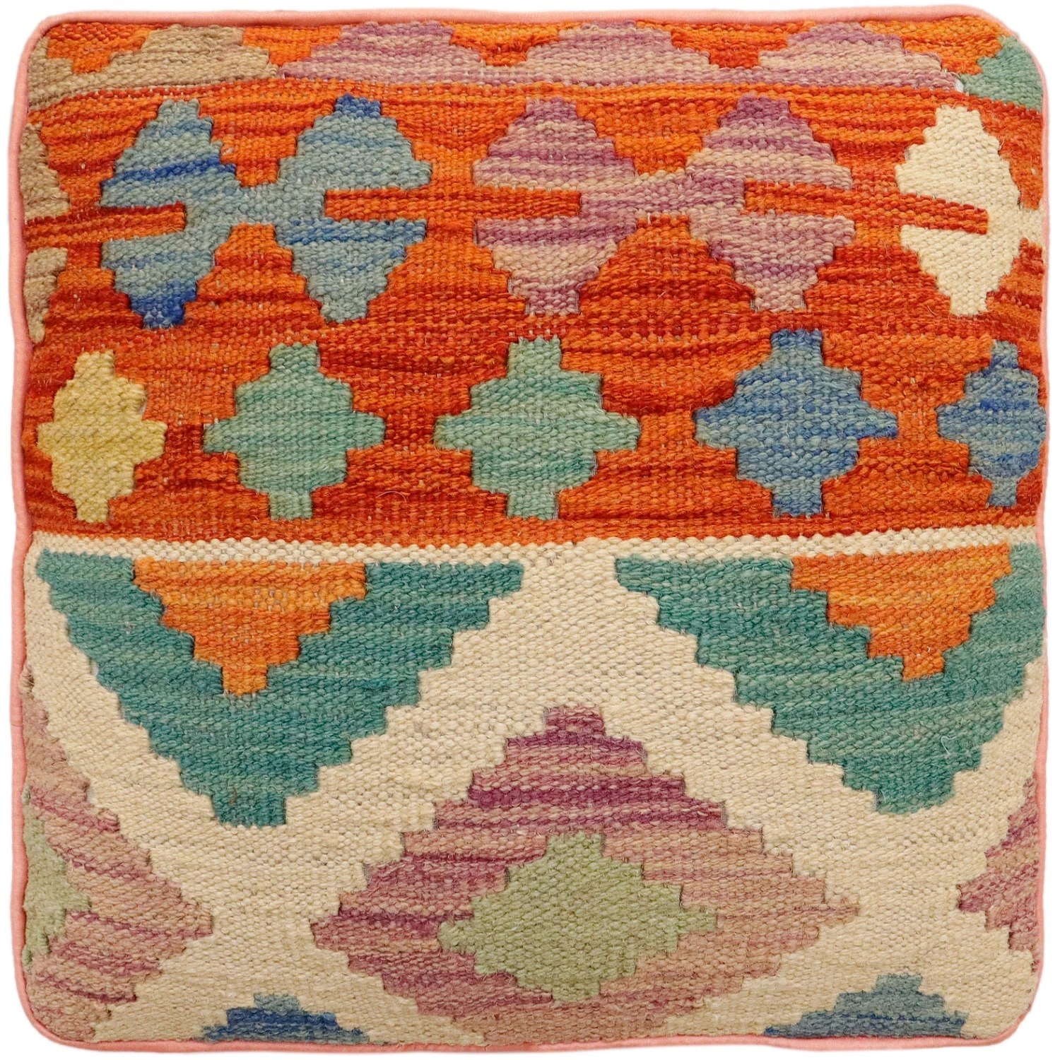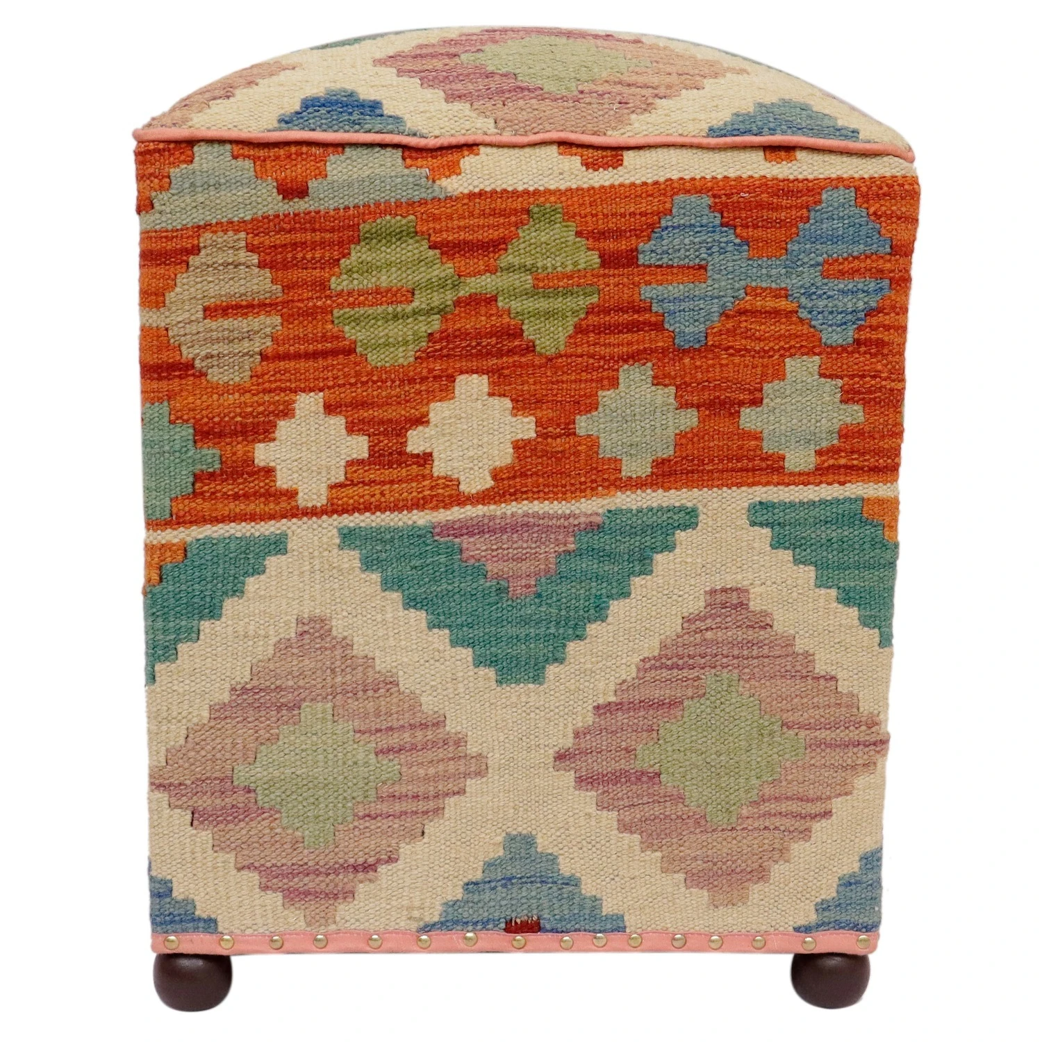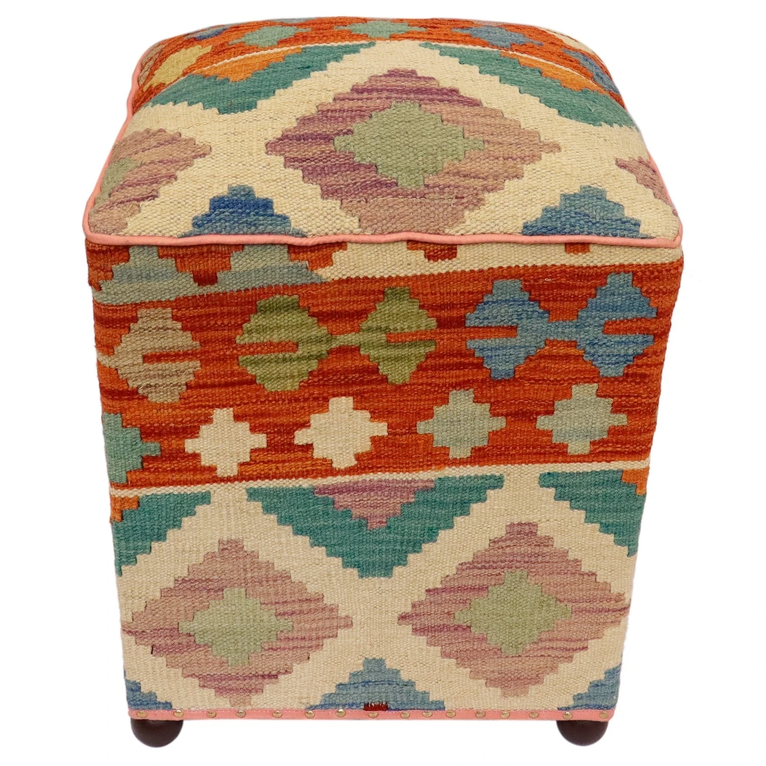 Seller’s Notes: Chic handmade ottoman crafted using wood and upholstered using hand-woven kilim wool rug is a multi-purpose fashion pouf which will add dimension, color and style to your decor. Inspired by geometric motifs in any array of effervescent color pallet grounds any space with elegance and sophistication.