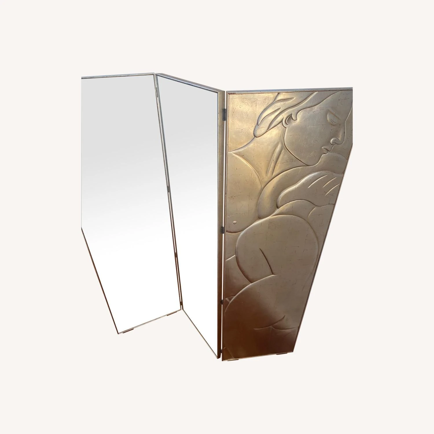 Seller’s Notes: A spectacular gorgeous and massive custom-ordered 3-panel screen made up of two fully mirrored panels and one exquisitely carved with a mid-century design. This oversized and heavy item is dramatic and refined and of the highest quality. — Christopher Guy website describes the item as above. This piece was $10,048 when purchased new.