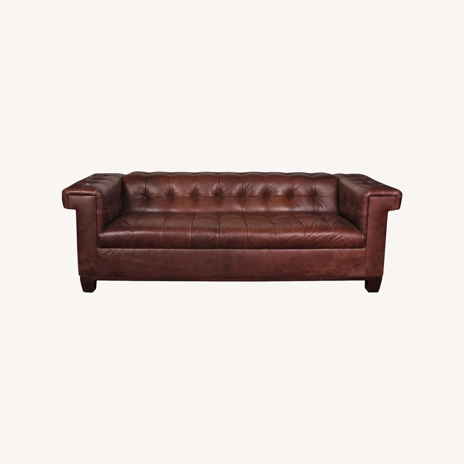 Seller’s Notes: Modern Chesterfield sofa with a take on the traditional 19th century English design with its squared arm and backrest and distinctive deep buttoned quilted leather upholstery and lower seat base. Comfortable and elegant, this deep chocolate piece will be the center of attention in any space.