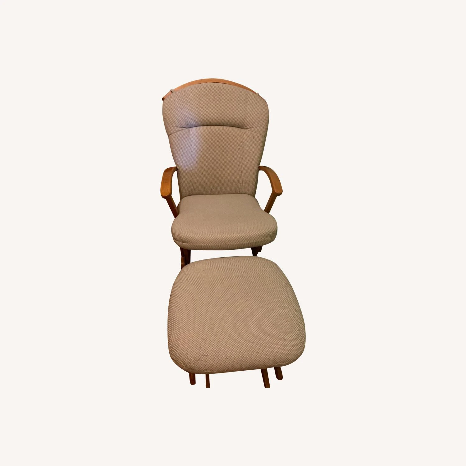 Seller’s Notes: Oak gliding chair and ottoman with green and grey check upholstery. It’s the original brand and style of these nursery gliders.
