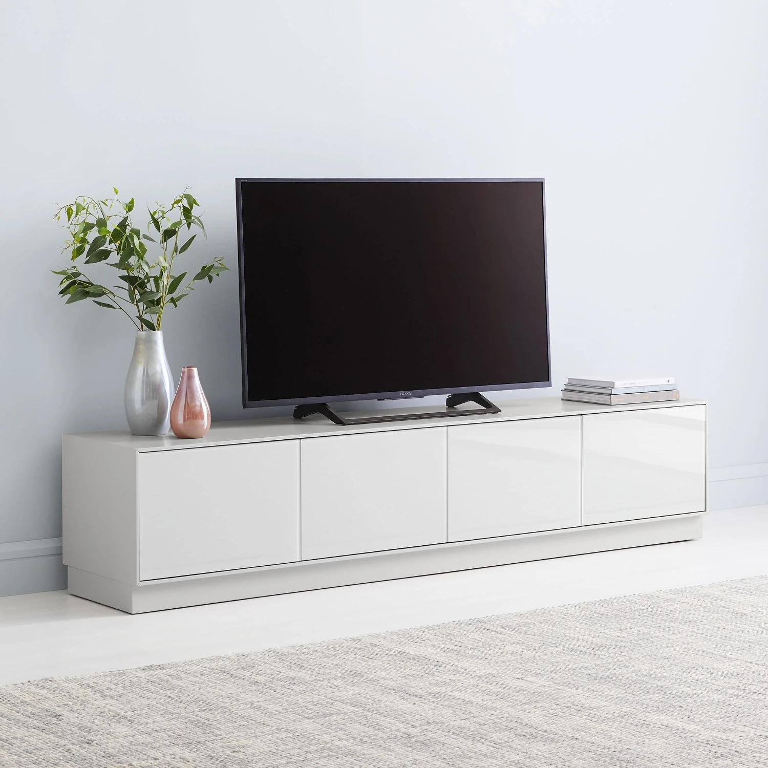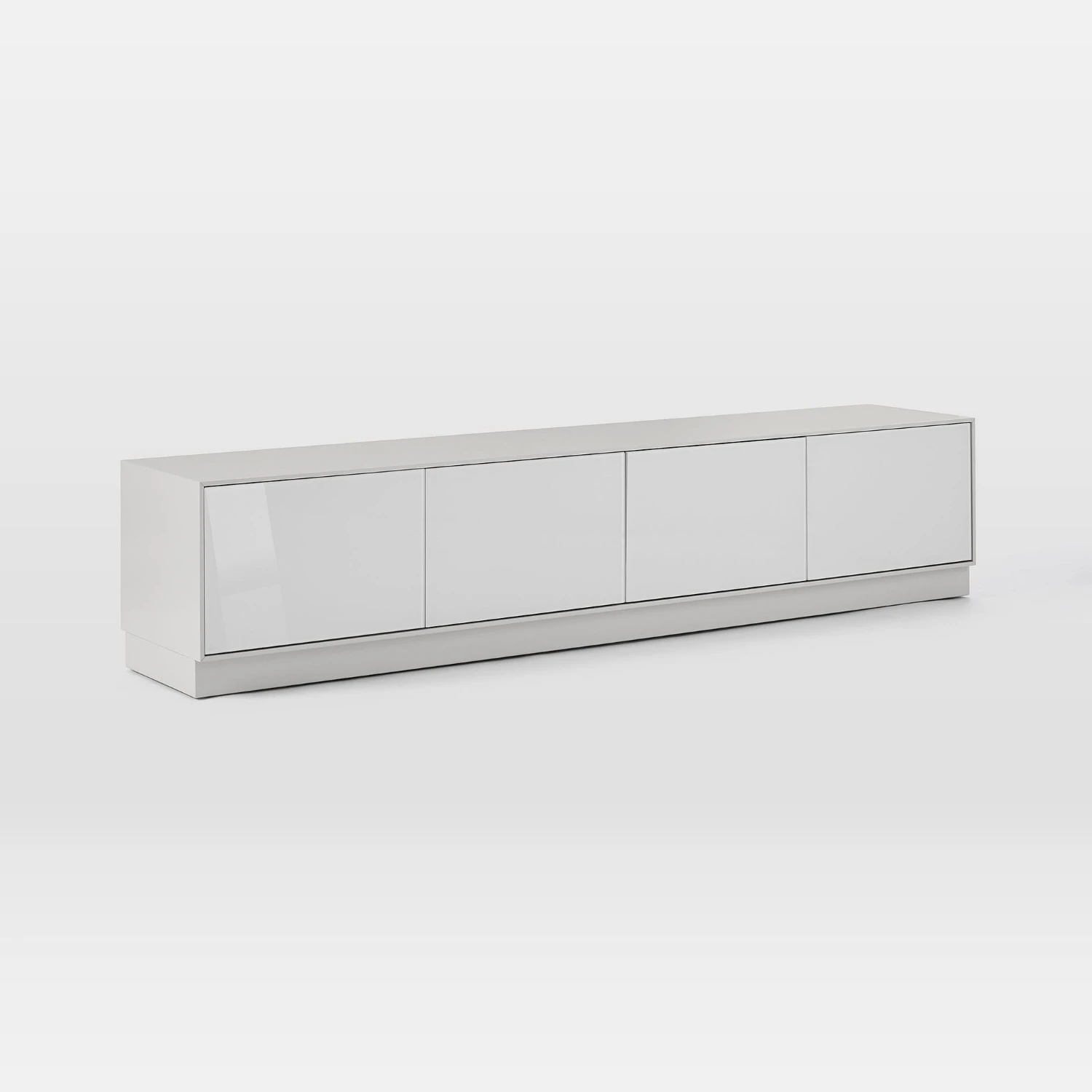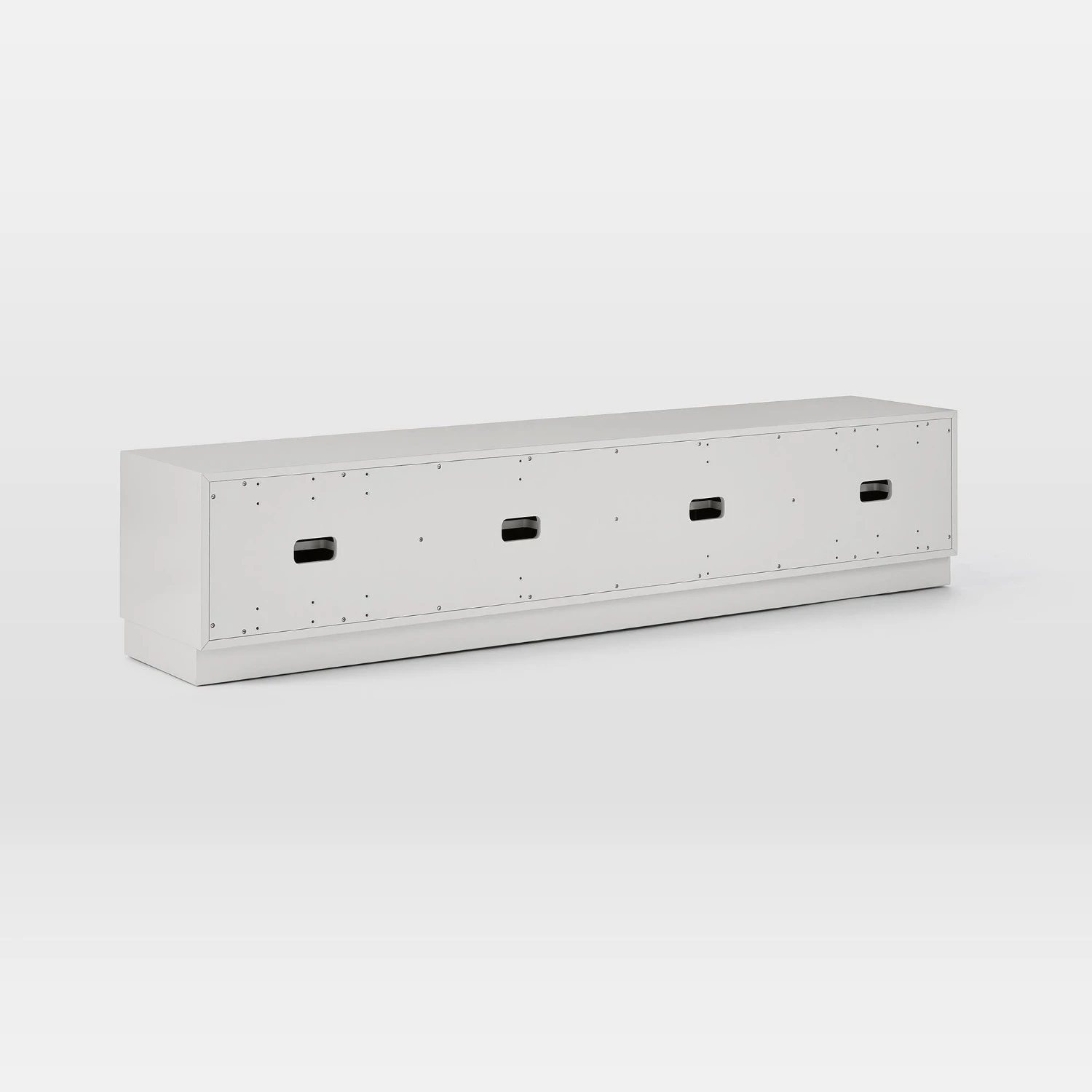 80″ console: 4 push-to-open doors open to reveal 1 adjustable shelf in each; 4 cutout openings; accommodates a flat screen TV up to 80″w.