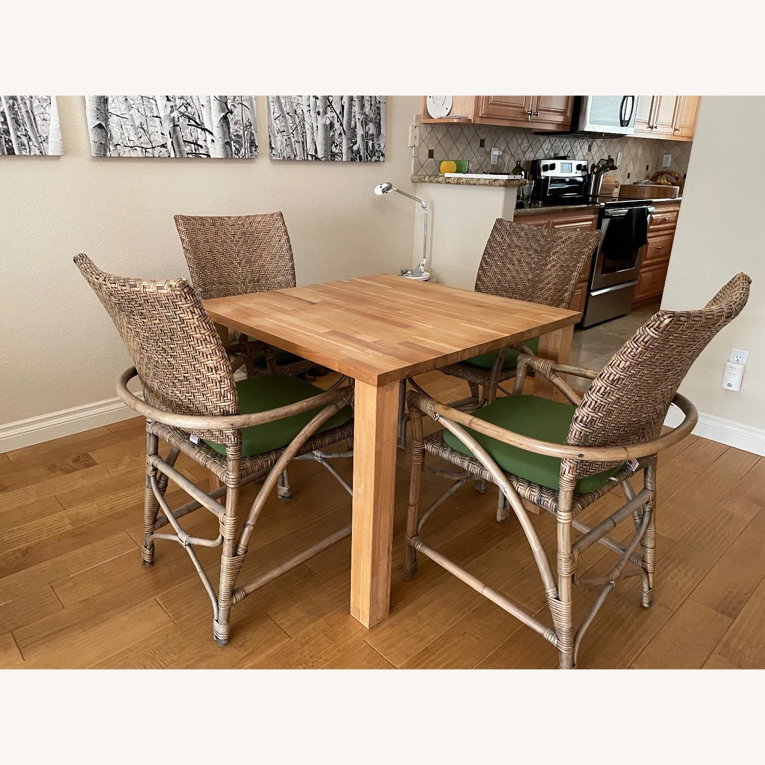Seller’s Notes: LAX Series by Mash Studio Solid English Walnut Dining Table and 4 Bamboo Chairs with cushions. Great for small (or medium-sized) spaces.