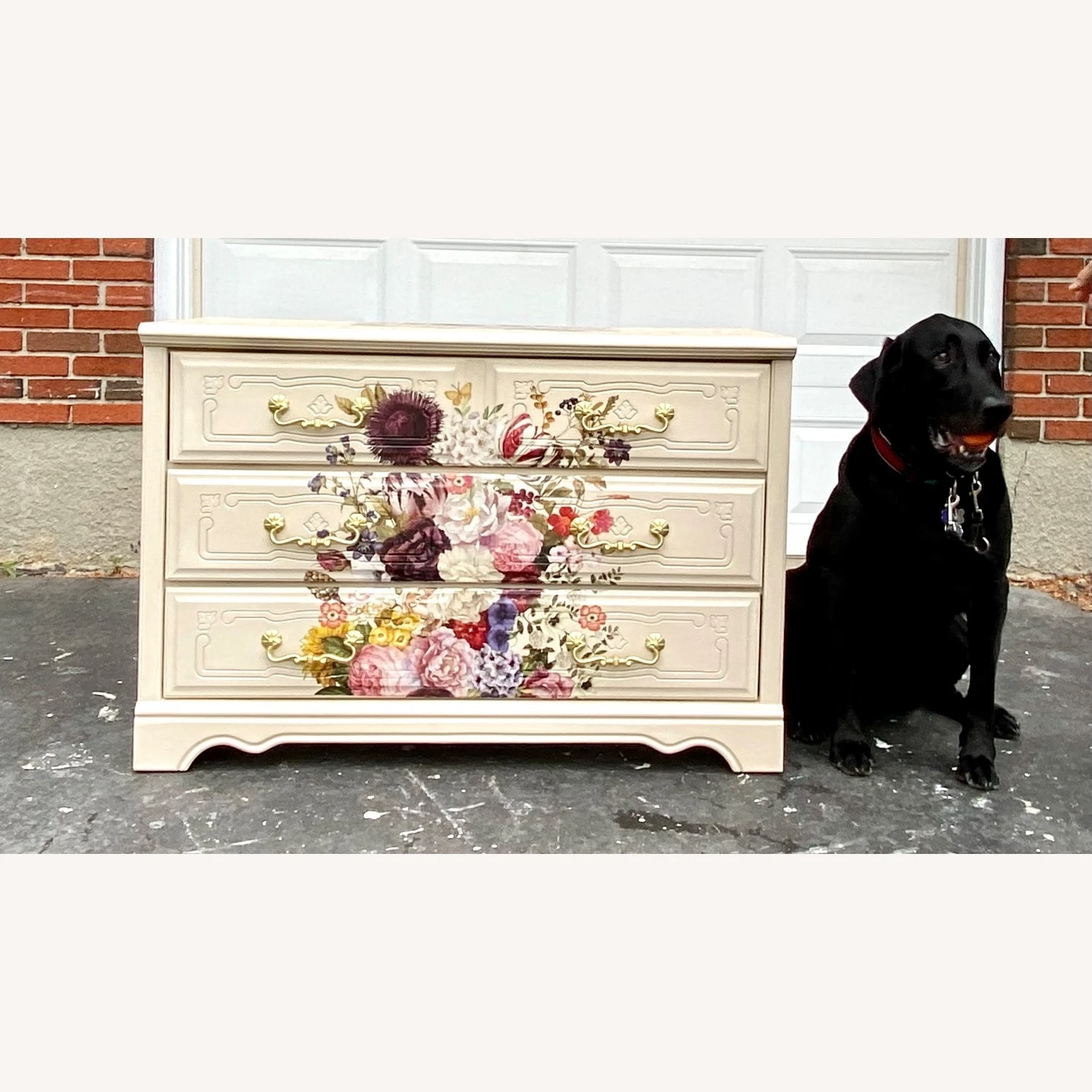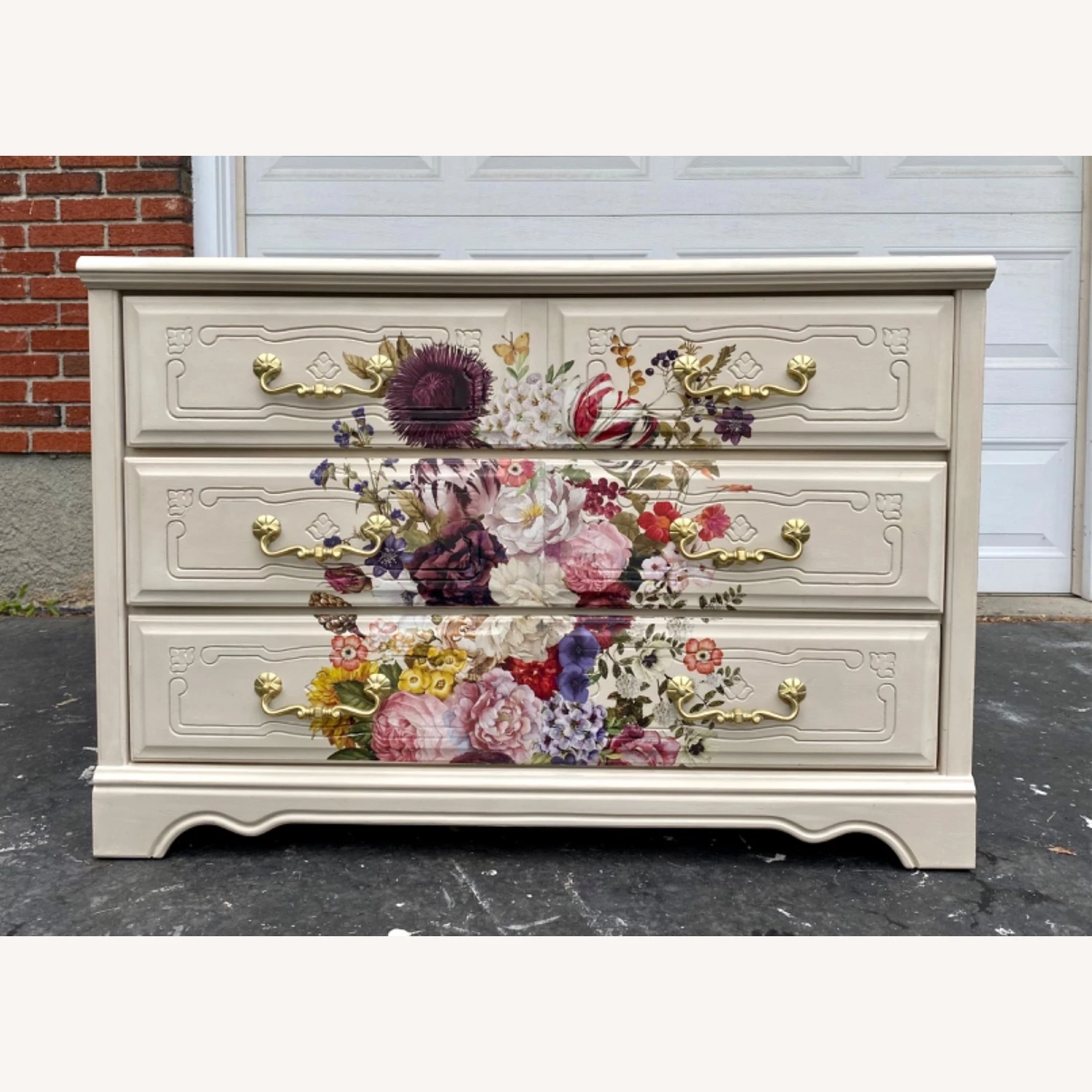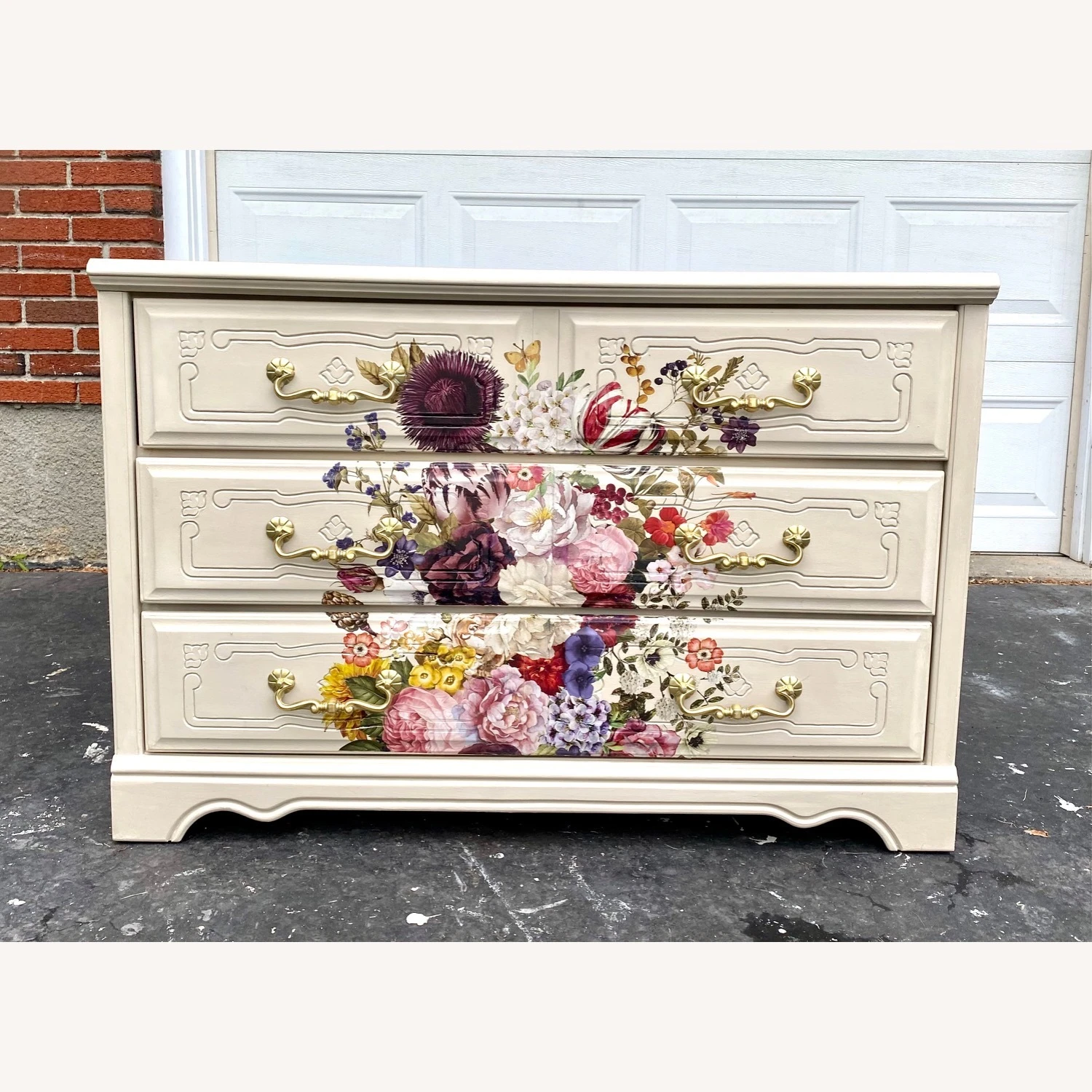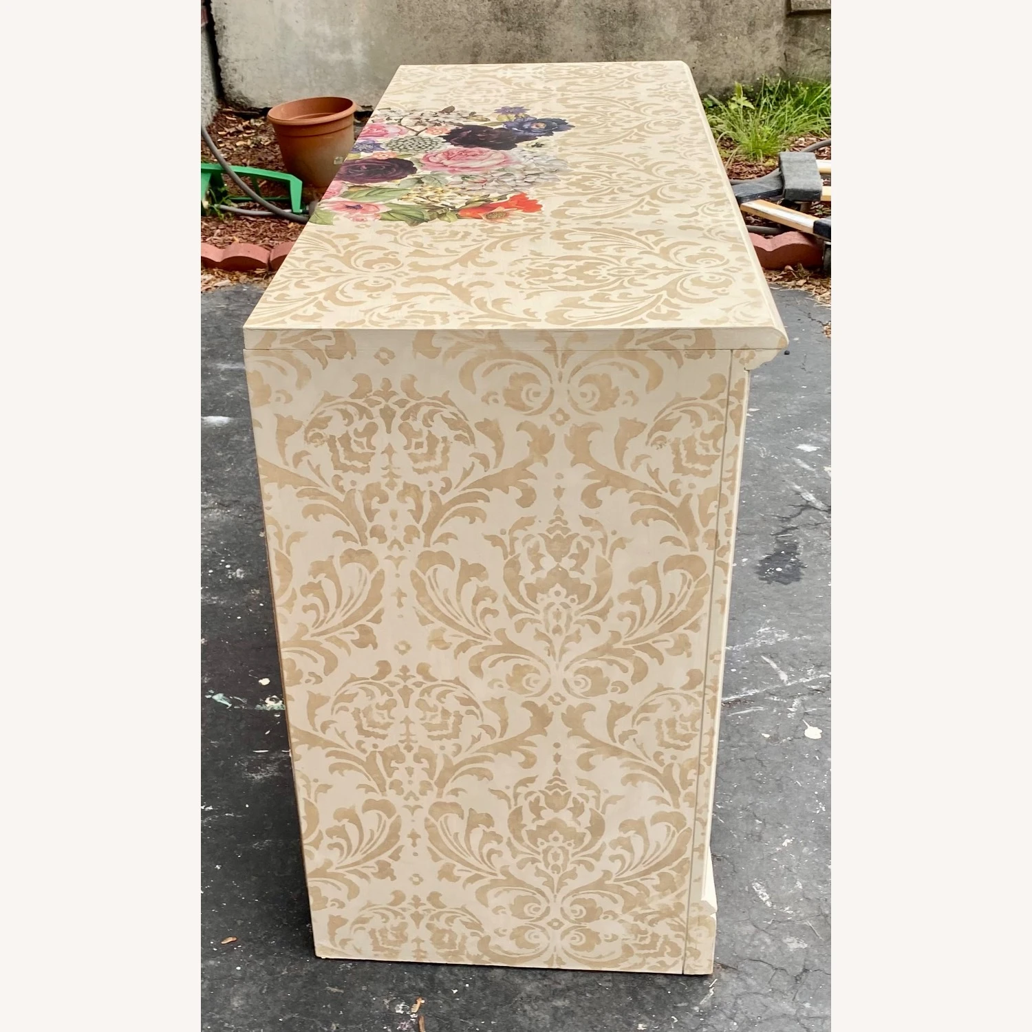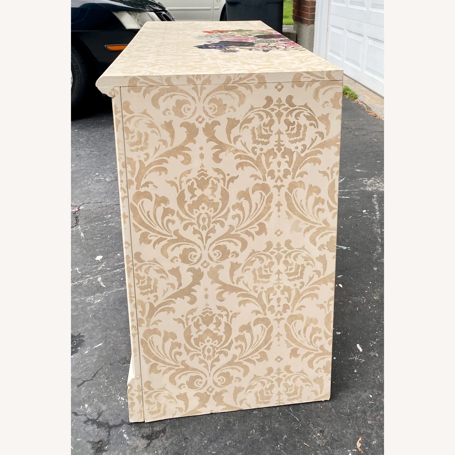 Seller’s Notes: To honor the Summer Solstice, this gorgeous three drawer dresser has been lovingly revived and now proudly wears a large bouquet of beautiful florals! Subtle damask stencils on sides and top add that extra elegance to make this a one of a kind statement piece!