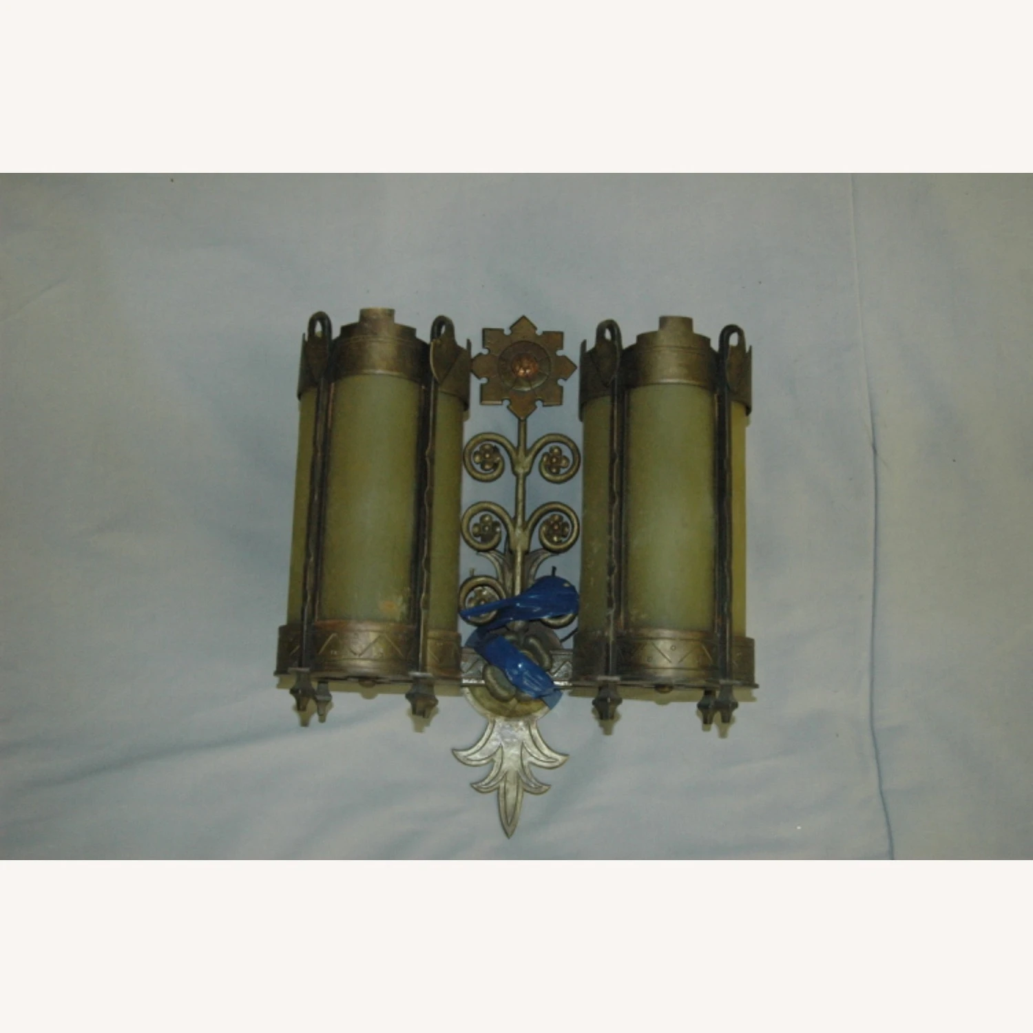 Seller’s Notes: This piece is an original gothic wrought iron sconce from the Williamsburg savings bank which was built in 1927. This piece features iron with bronze and copper detailing, and original amber glass. After the gut renovation in 2006 we acquired these pieces and several other large chandeliers and pendants. These are the last remaining pieces of the collection and hold significant historical value. One of the last remaining remnant’s of the most iconic architectural marvels of the past. A true New York City gem.
