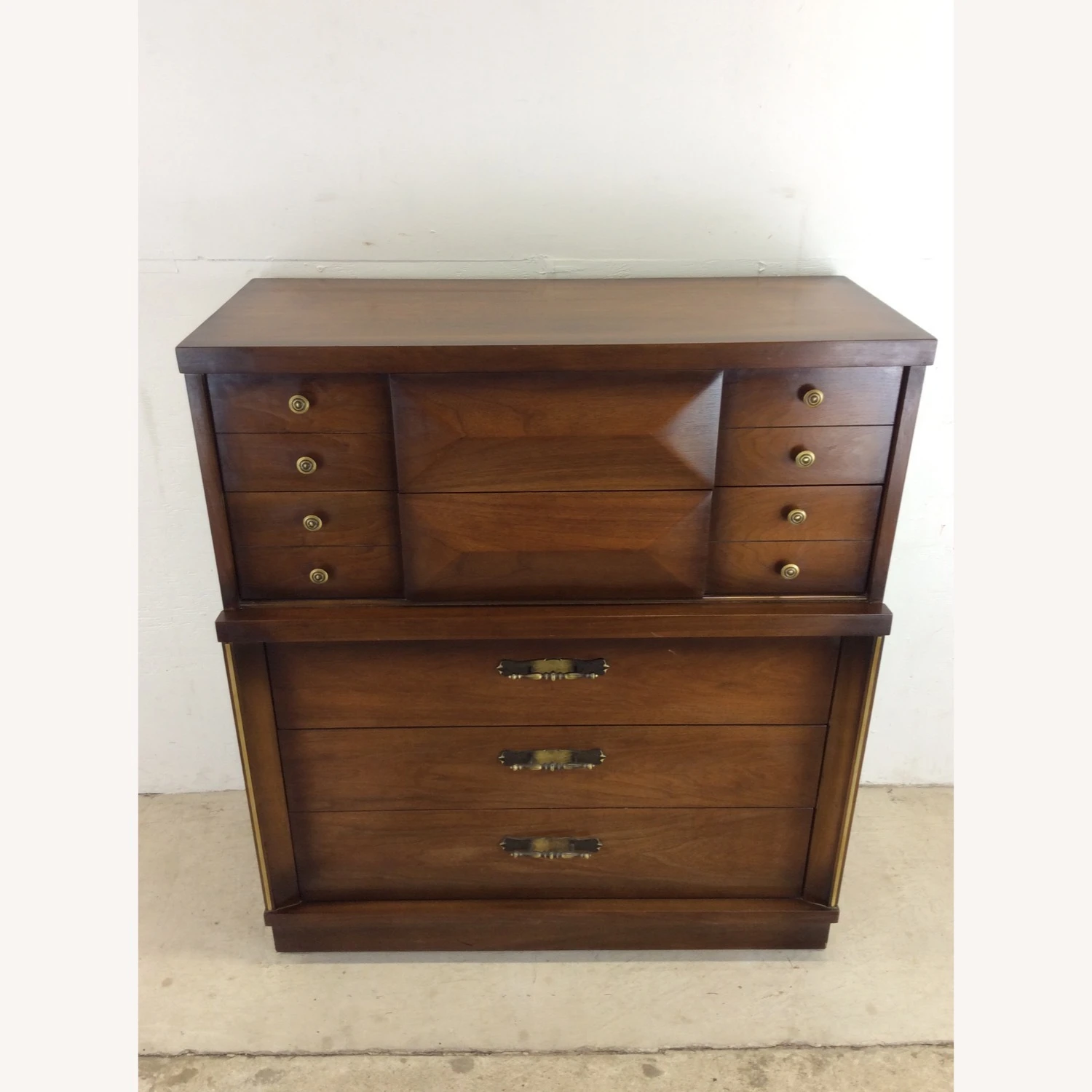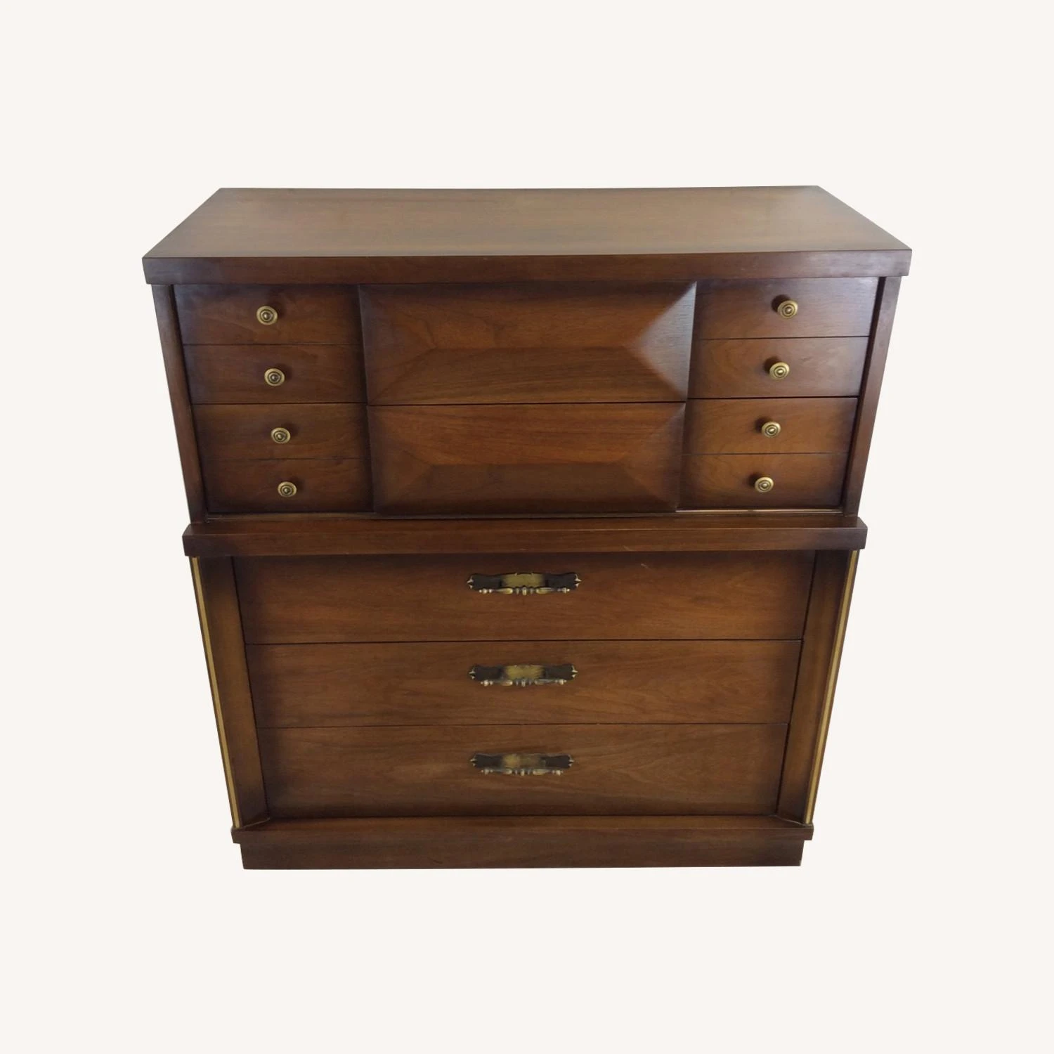 Seller’s Notes: This mid century highboy dresser features hardwood construction, walnut veneer with original finish, five dovetailed drawers with original brass accented hardware, top two drawers feature beveled center detailing.