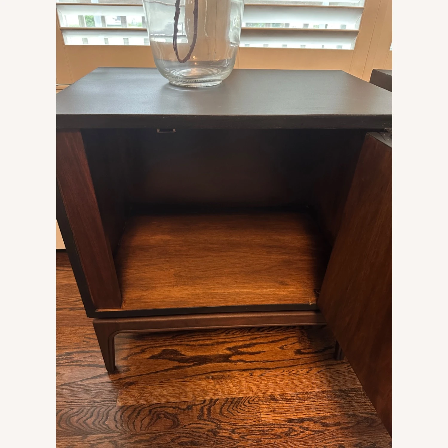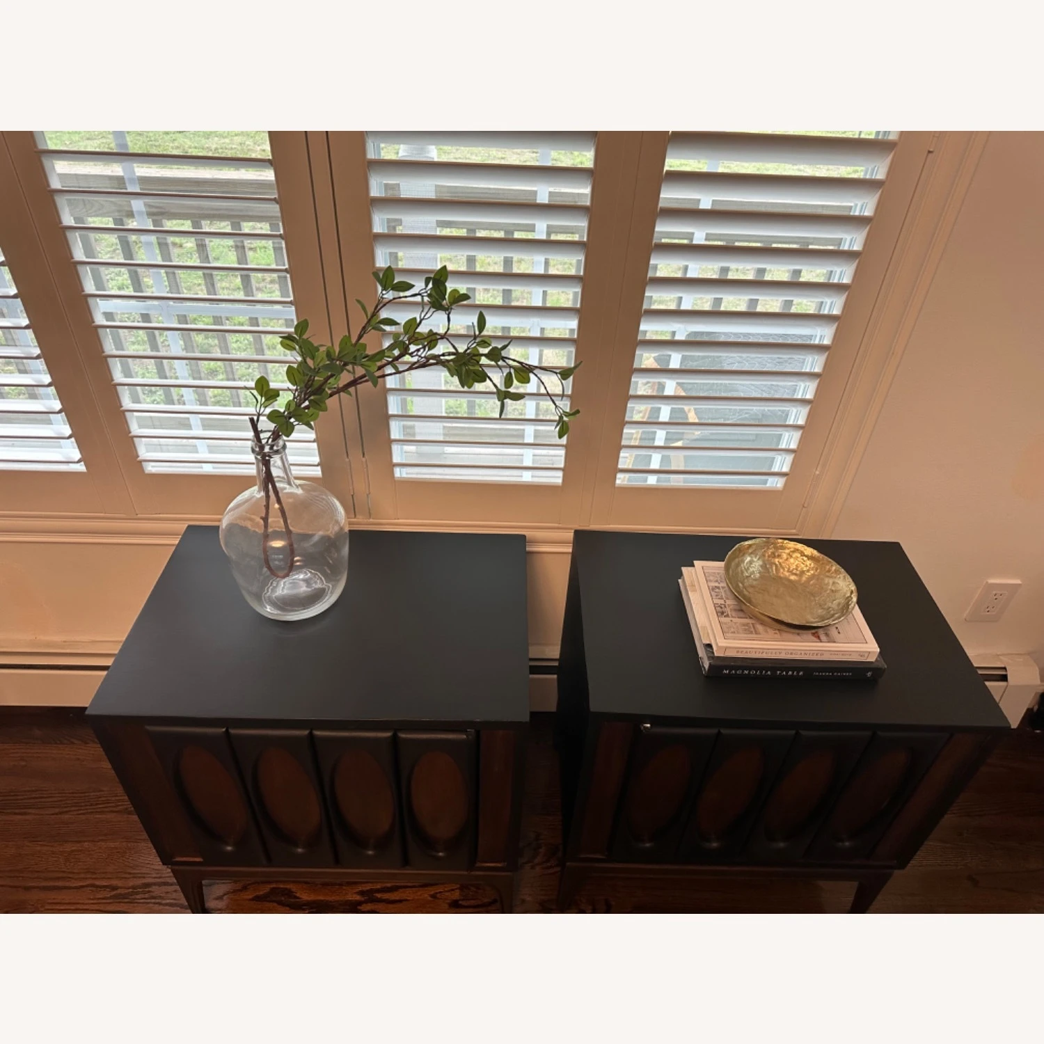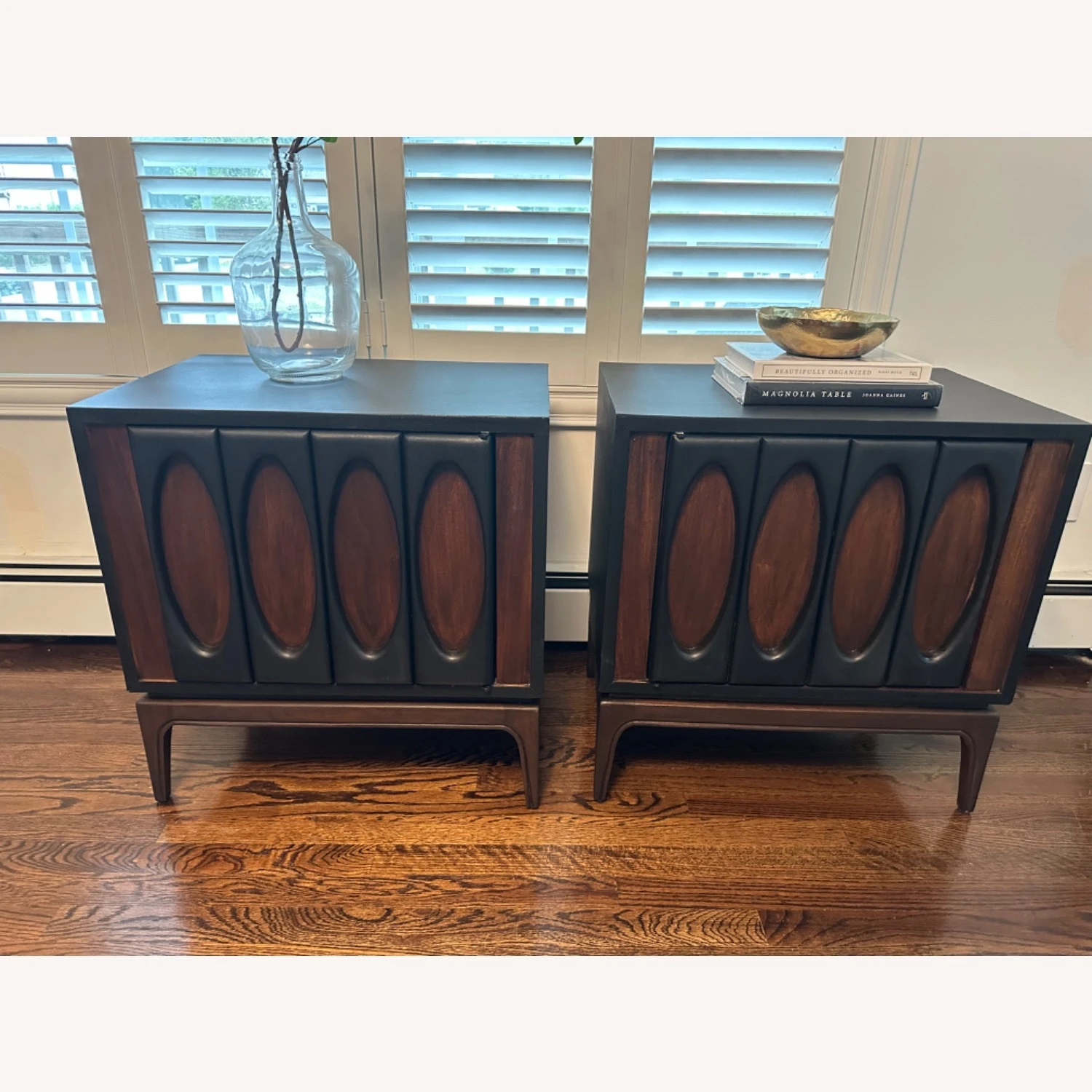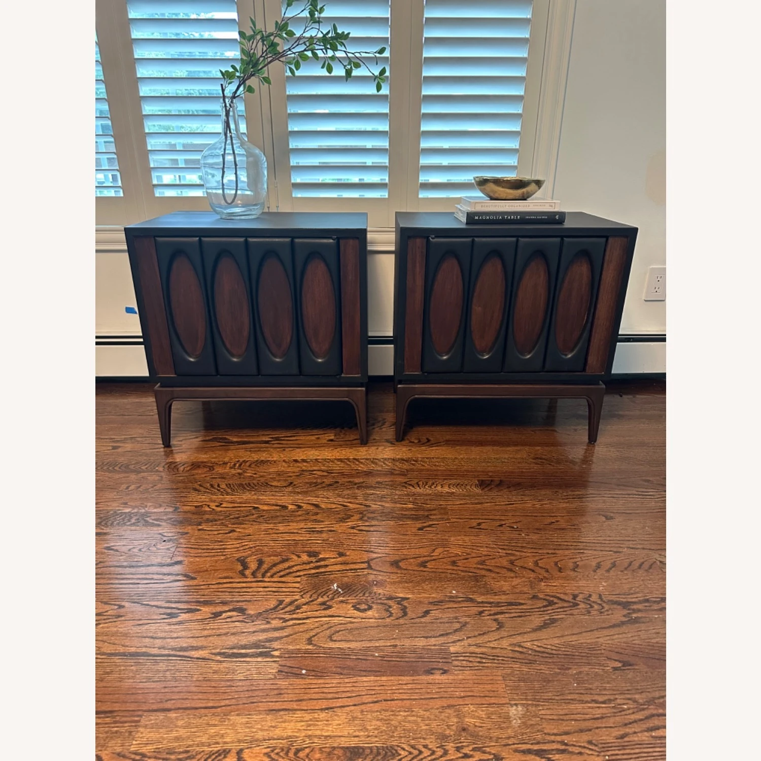 Seller’s Notes: This listing is for a pair of Mid-Century Modern possible Lane (no brand on the piece) Walnut Nightstands. Featuring a cube shape with an oval brutalist design on the doors painted in “Coal black” by fusion Mineral, the door opens up to storage space nightstands. Plenty of space in the interior cabinet to secret away your midnight snacks and other goodies.