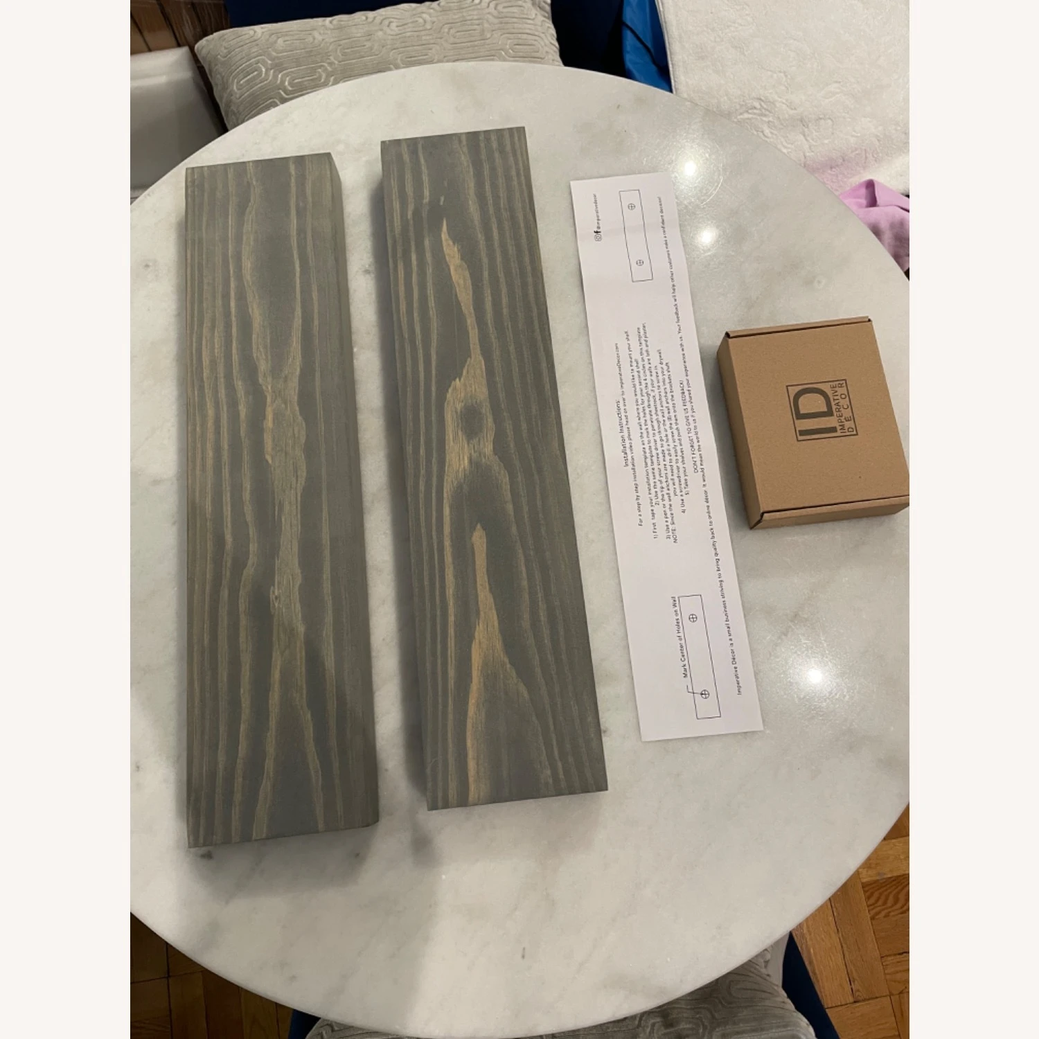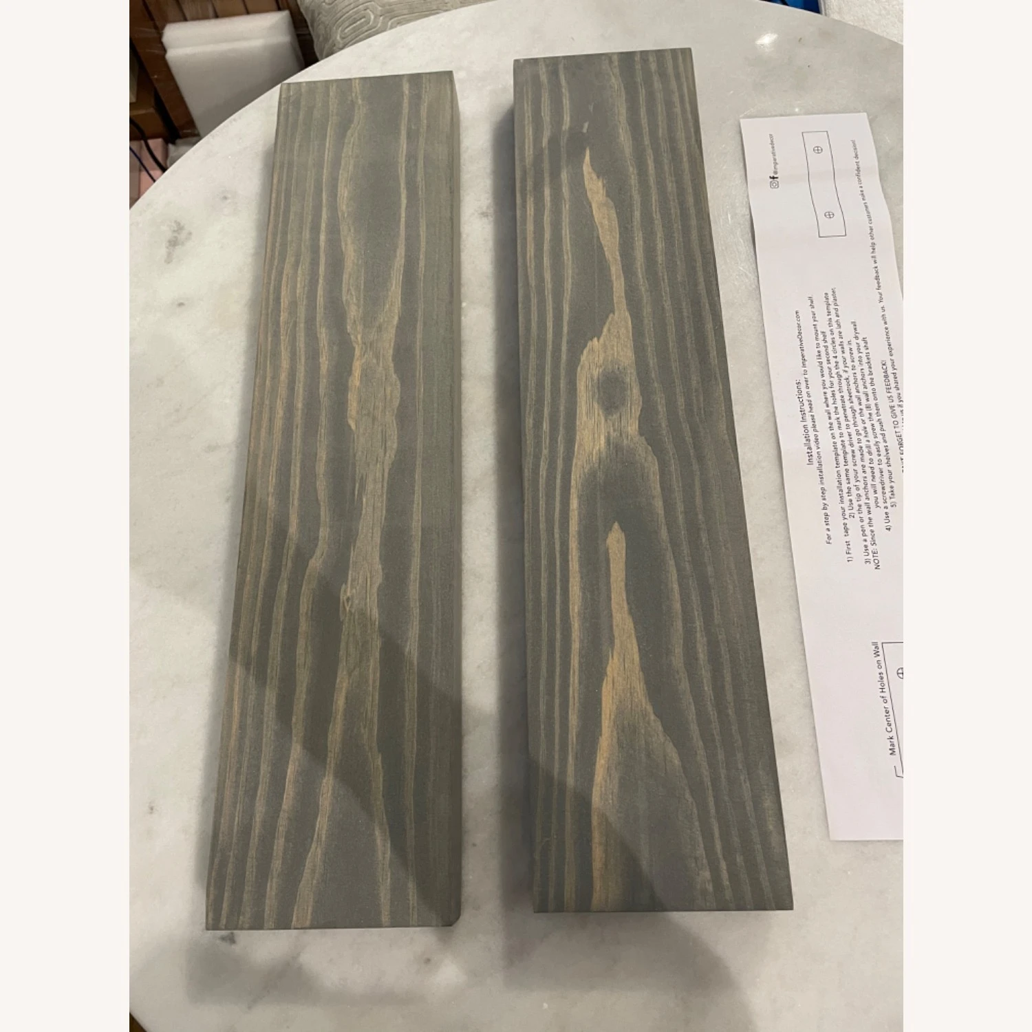 Seller’s Notes: Set of 2 gray floating shelves, 24 inches wide in solid wood, washed gray finish. Brand new, still in the box and ready to hang! These shelves will work well in any room and are just the right width to store or display!