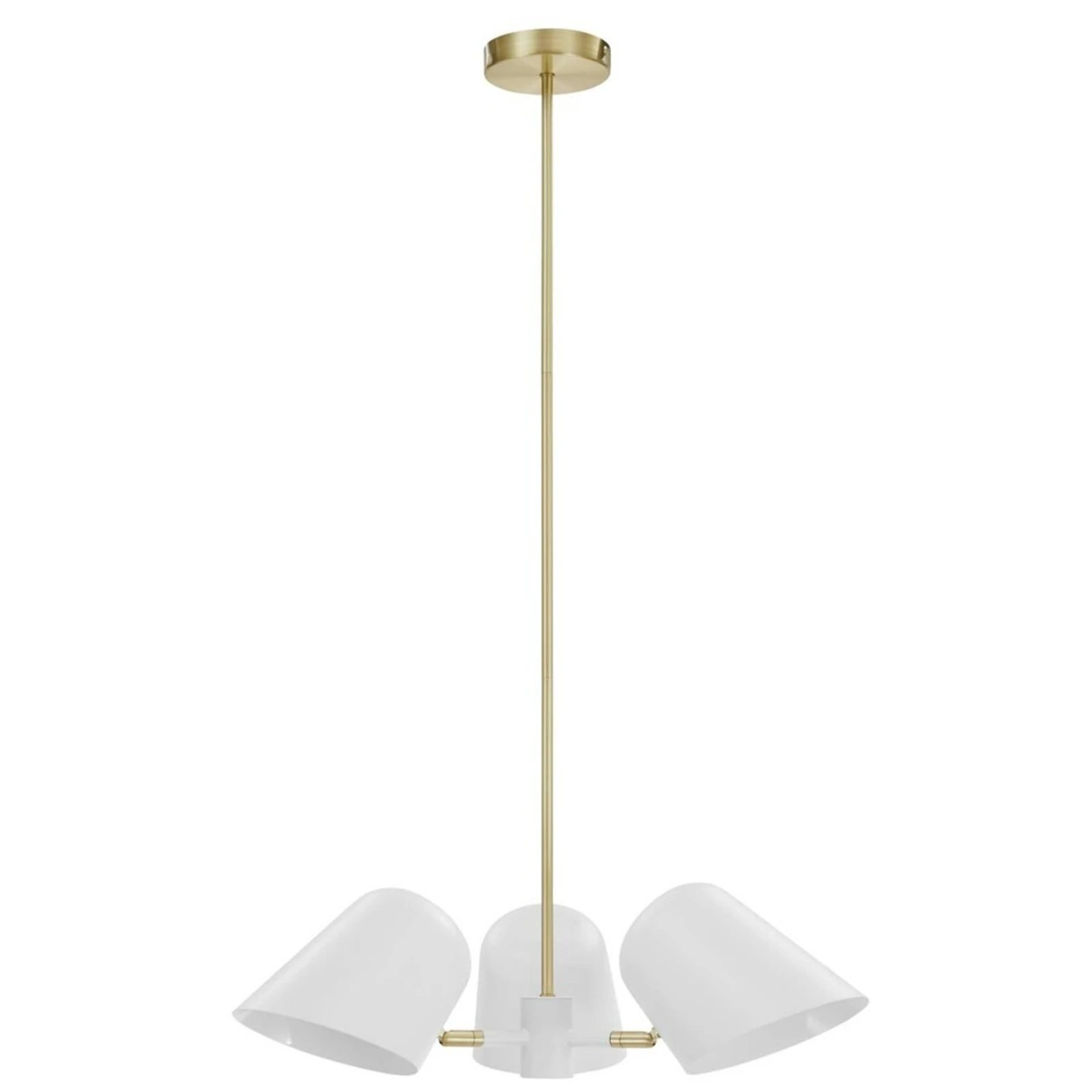 • A powder-coated satin brass ceiling canopy, height-adjustable hanging rods, and three pleasingly asymmetrical lampshades infuse this hanging light with character and presence.