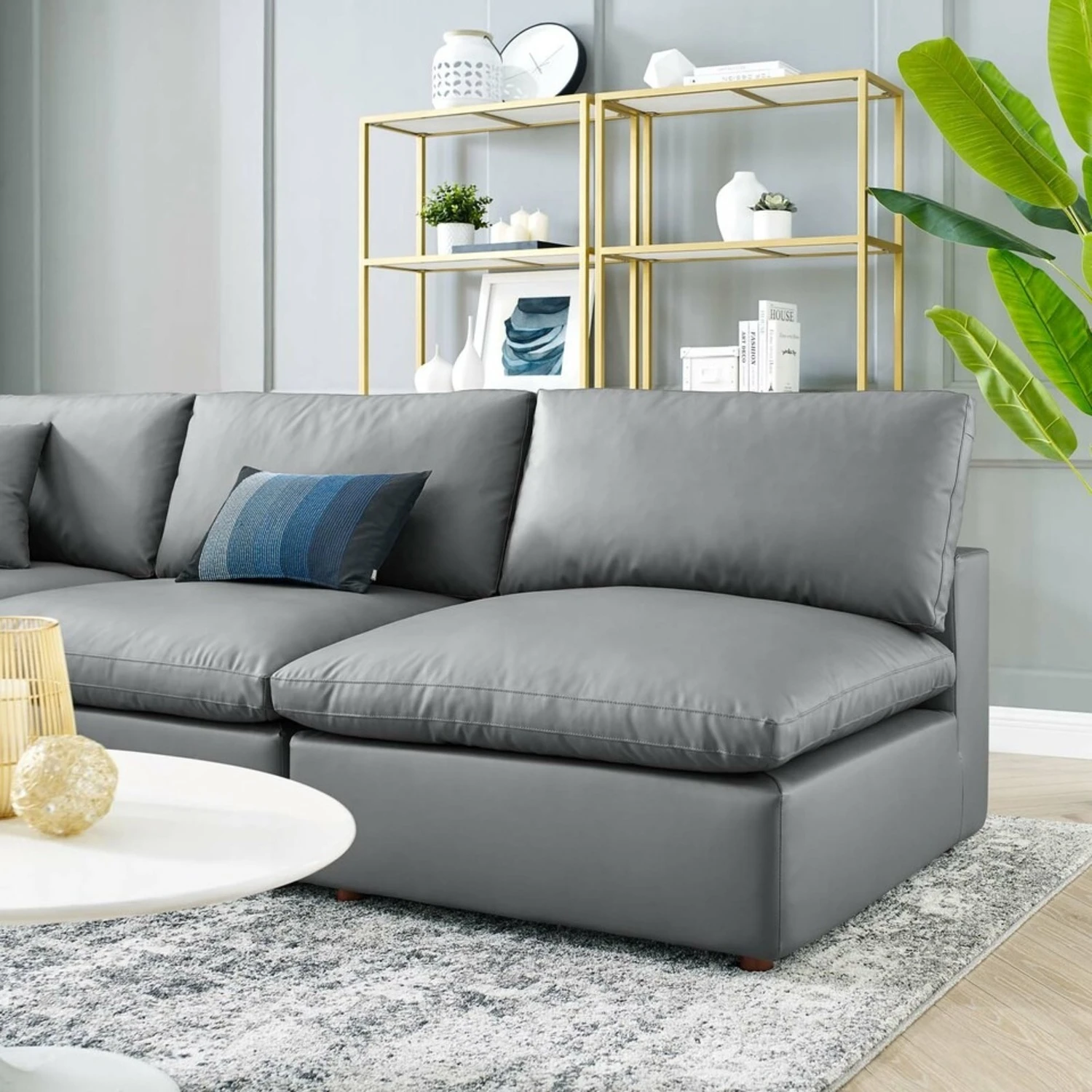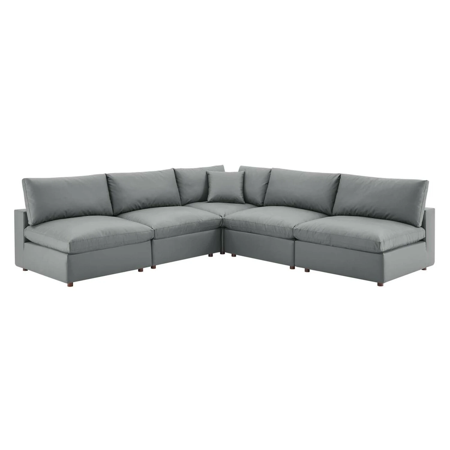 • Covered in vegan leather, this upholstered sectional sofa comes with a solid wood construction and foam padded and duck down cushions for a luxurious sink-in feel.