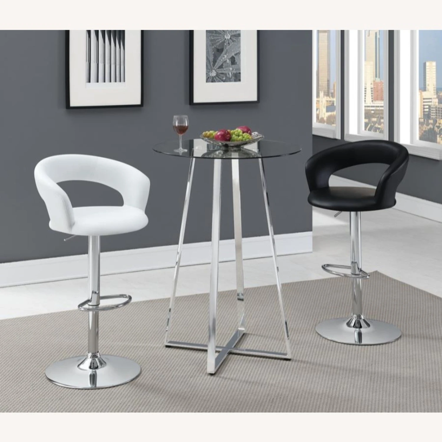• Manufactured with a durable steel construction, this adjustable bar stool features white faux leather and a high polished chrome finish.