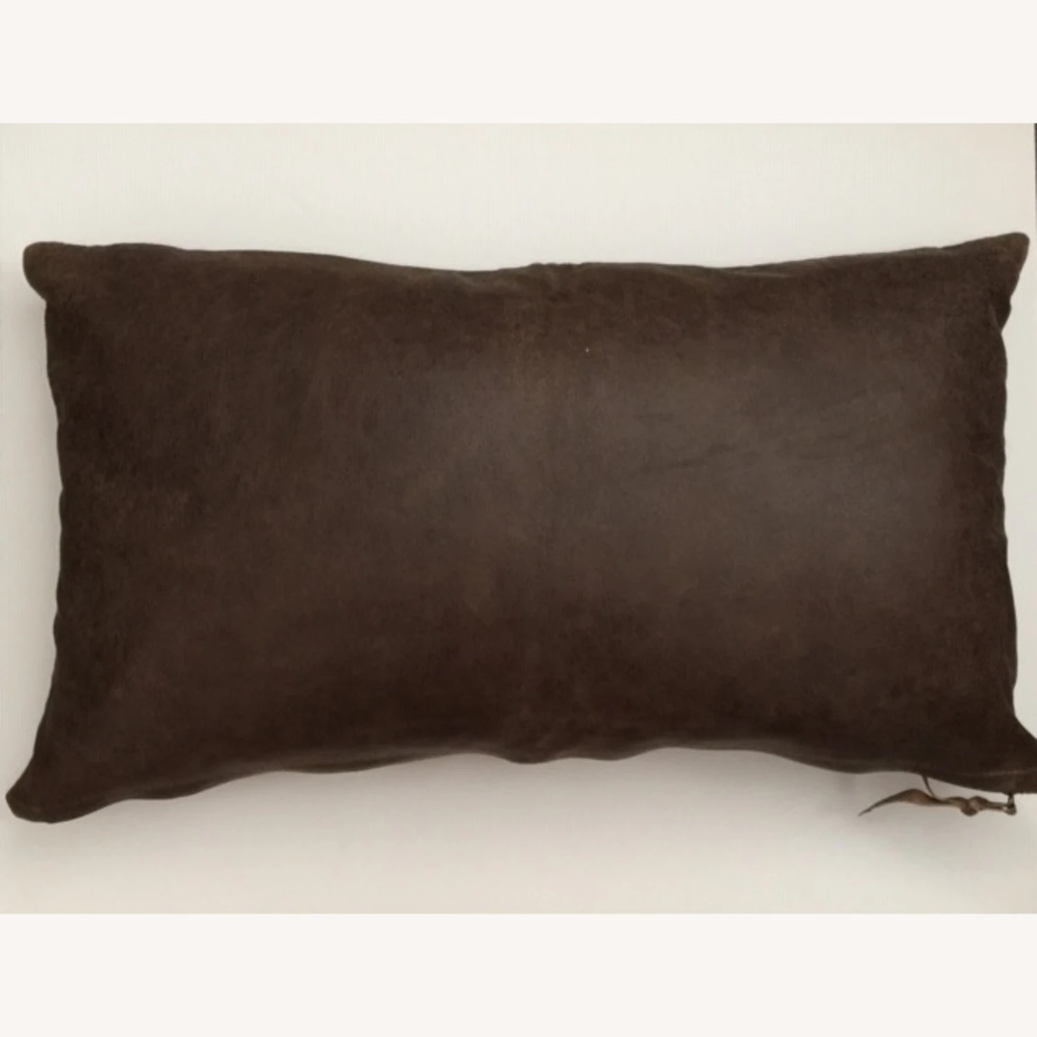 Seller’s Notes: Beautifully intricately hand-embroidered in contrast embroidery thread, this botanical leaf branch design takes a modern look in this large-scale with this intricate etching embroidery technique. Amazing decor and perfect to pair with a print or solid color story theme. Front and back is 100% soft distress leather in a Cocoa color. Feather/Down pillow insert included for a soft and comfortable luxurious feel.