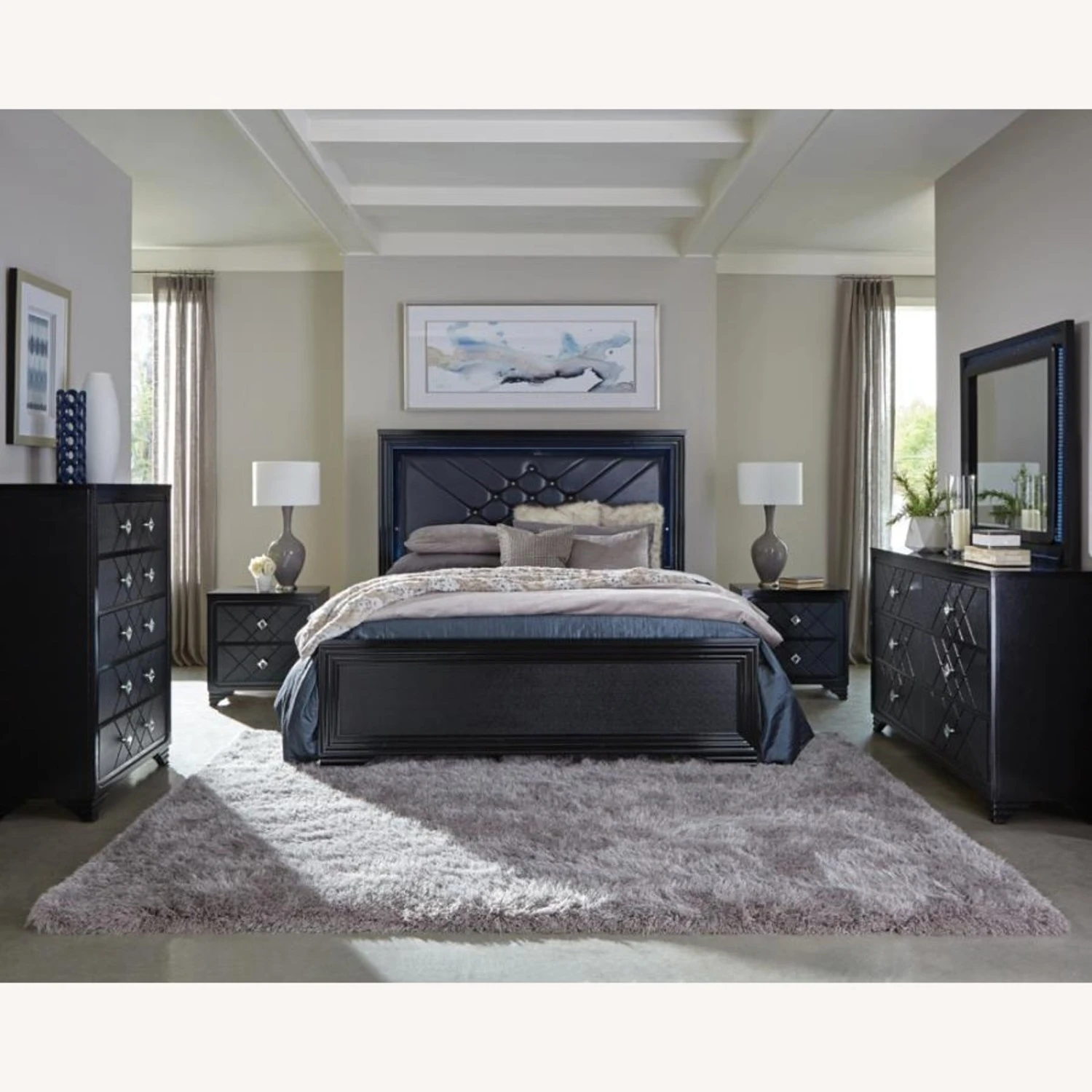 • Headboard and mirror feature blue LED touch lighting for ambiance