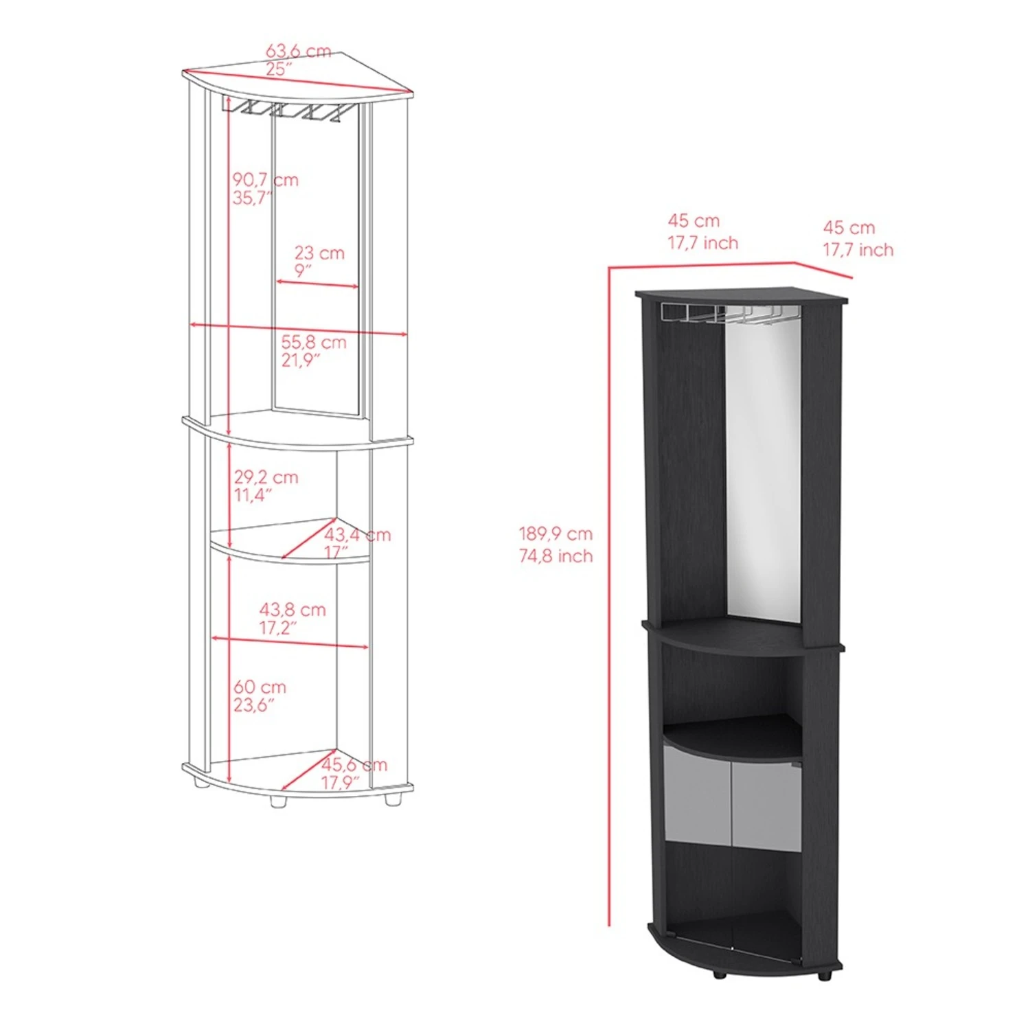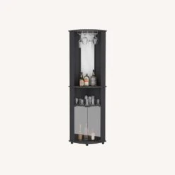 Seller’s Notes: Rialto corner bar cabinet This elegant and stylish corner bar is ideal for any home looking to add a touch of exclusivity. Built-in storage makes it easy to keep your most desired drinks and snacks close at hand. Includes ample storage with three shelves (35.7″ H x 21.9″ W), make your next party one to remember with the Essential Corner Bar. Designed with an elegant black wengue manufactured wood finish.