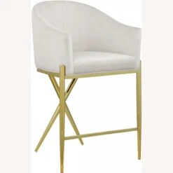 • This stool features a rich cream velvet upholstered barrel-style seat and back cushion and rests on gold metal legs with a metal frame for durability.