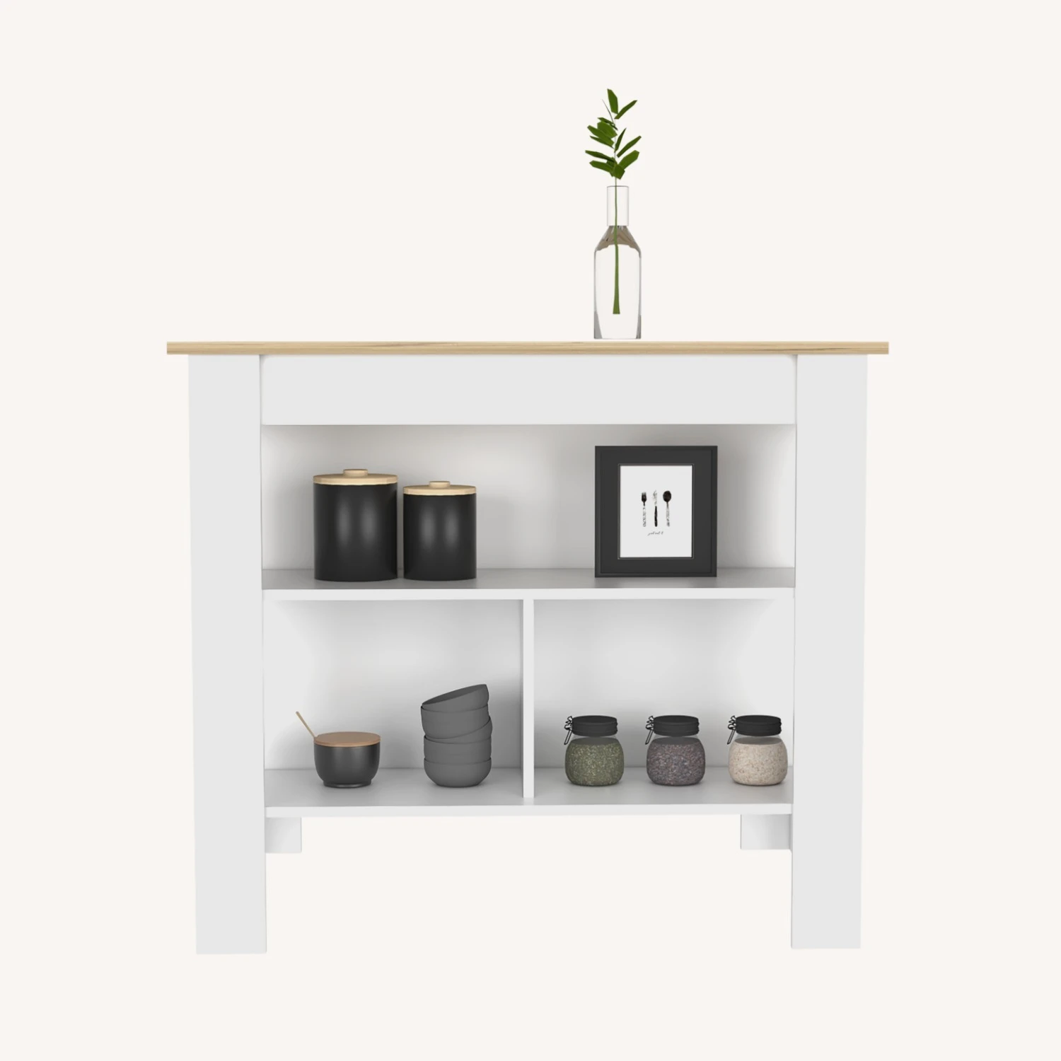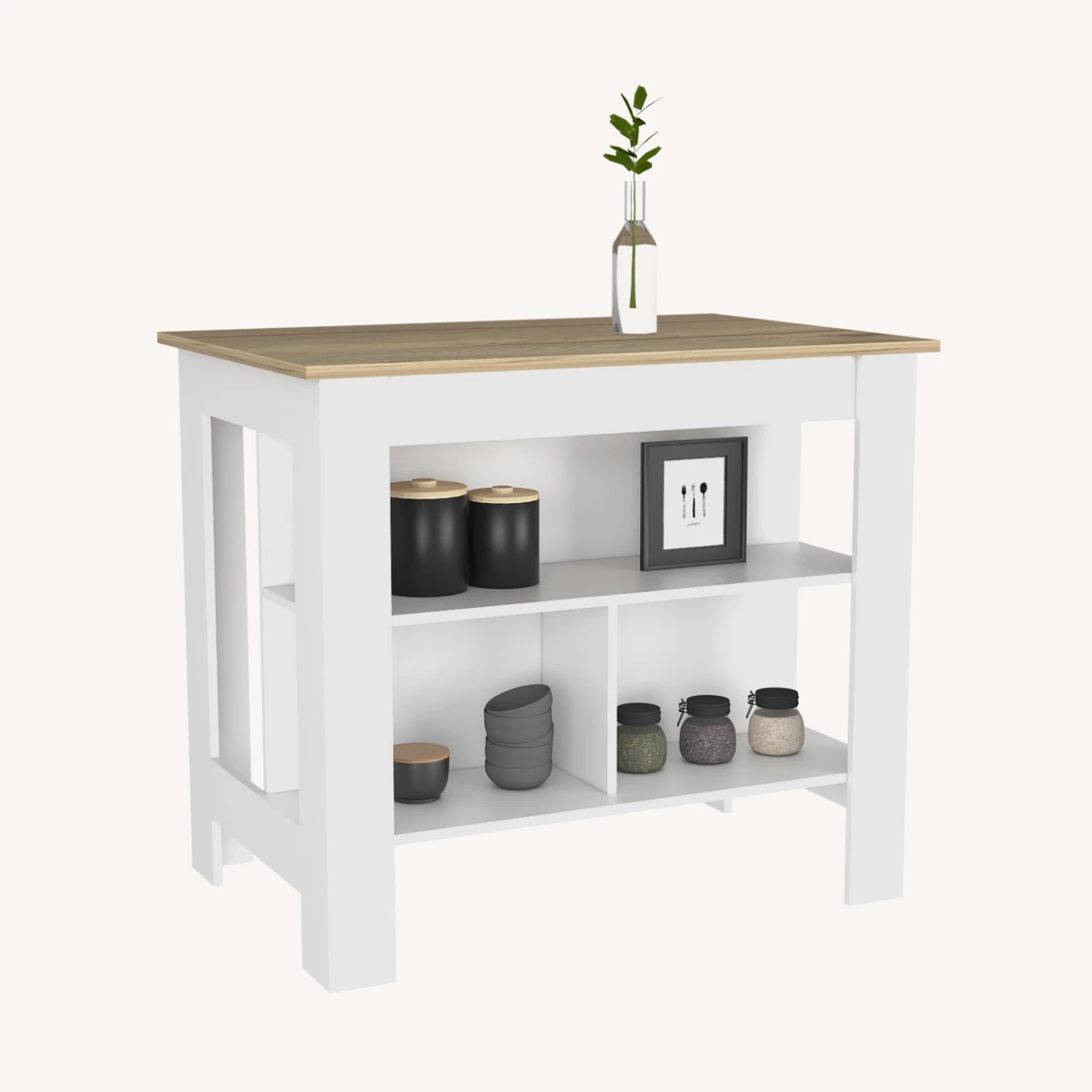 Seller’s Notes: “Dozza Kitchen Island antibacterial, is our flagship product and now with an antibacterial surface! This unique kitchen island brings life to the interior of your kitchen thanks to its modern ergonomic design; it also has colors that give glamour, luxury, and elegance to the interior of your kitchen; this kitchen island is an excellent choice for medium and large you a spacious top surface (27-inch deep x 40.5 inches wide) with scratch-kitchens that want to give life and unique designs, it is an efficient piece of furniture that does not occupy great space inside your kitchen. It is made of wood with a beautiful color combination between the base and the top. It will enhance your kitchen space by giving resistant melamine. Below the top, you will find a great space to store your stools on one side and a convenient shelves space on the other, with one wide shelf at the top and two smaller frames at the bottom. This shelving space is a practical place to store your pans, pots, or even decor looks fantastic on this kitchen island. Designed with elegant white-light oak manufactured wood finish.