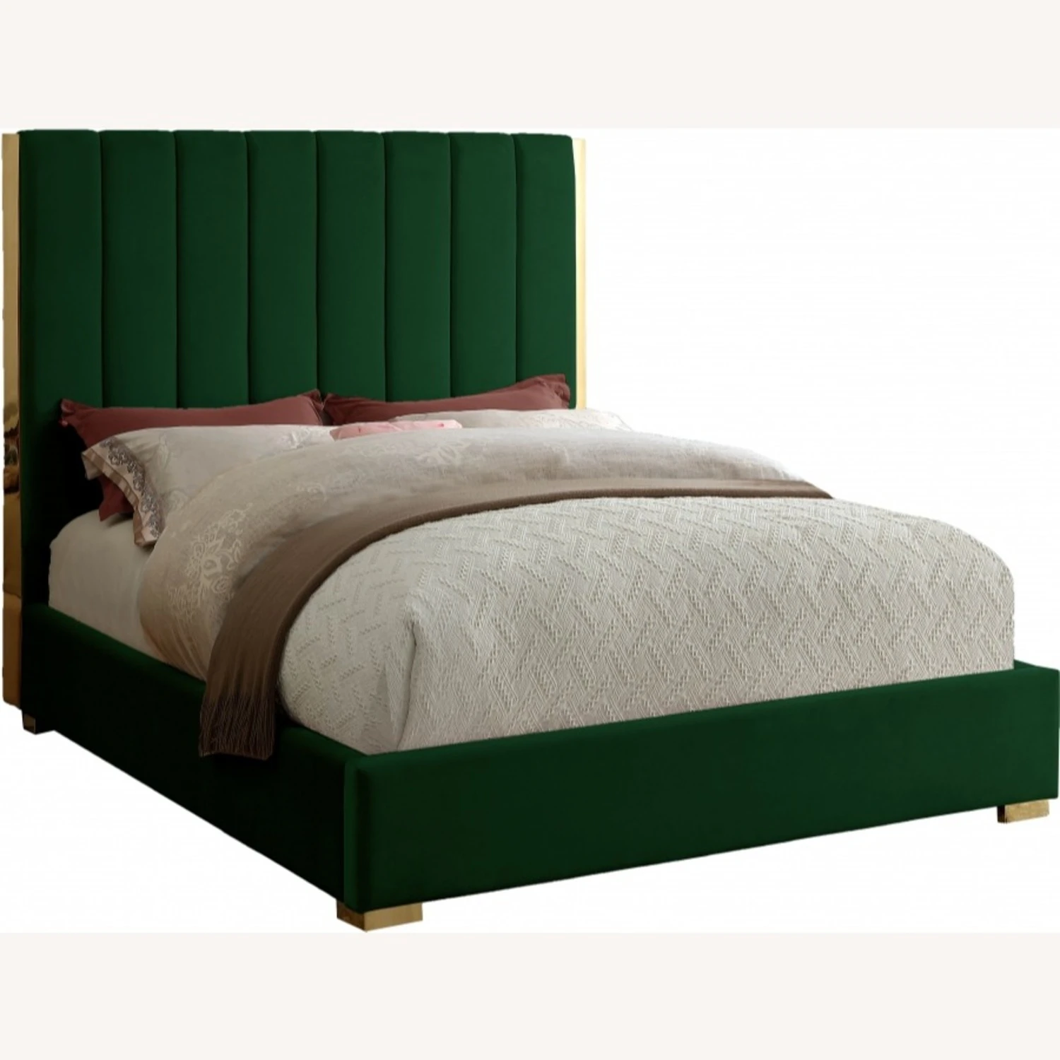 • Featuring a green velvet base with channel tufting atop a polished gold metal frame, this full-size bed makes a bold statement even when incorporated with existing contemporary bedroom decor.