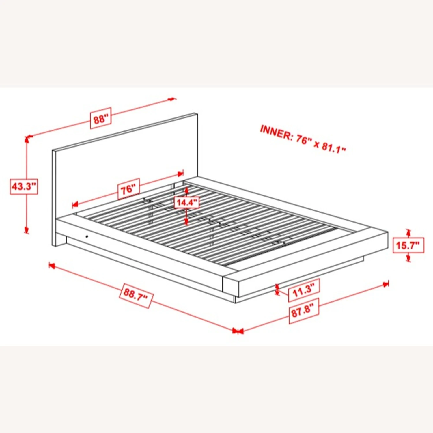 King Bed 88.00”w x 88.75”d x 43.25”h (14 slats)