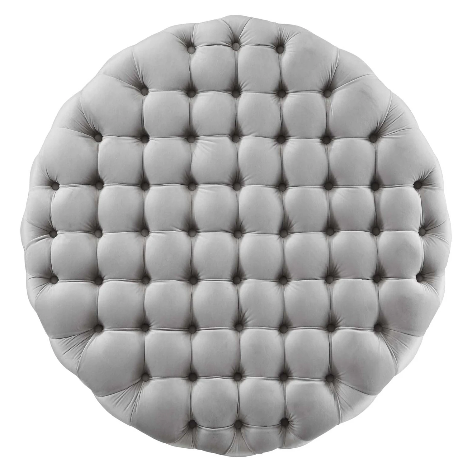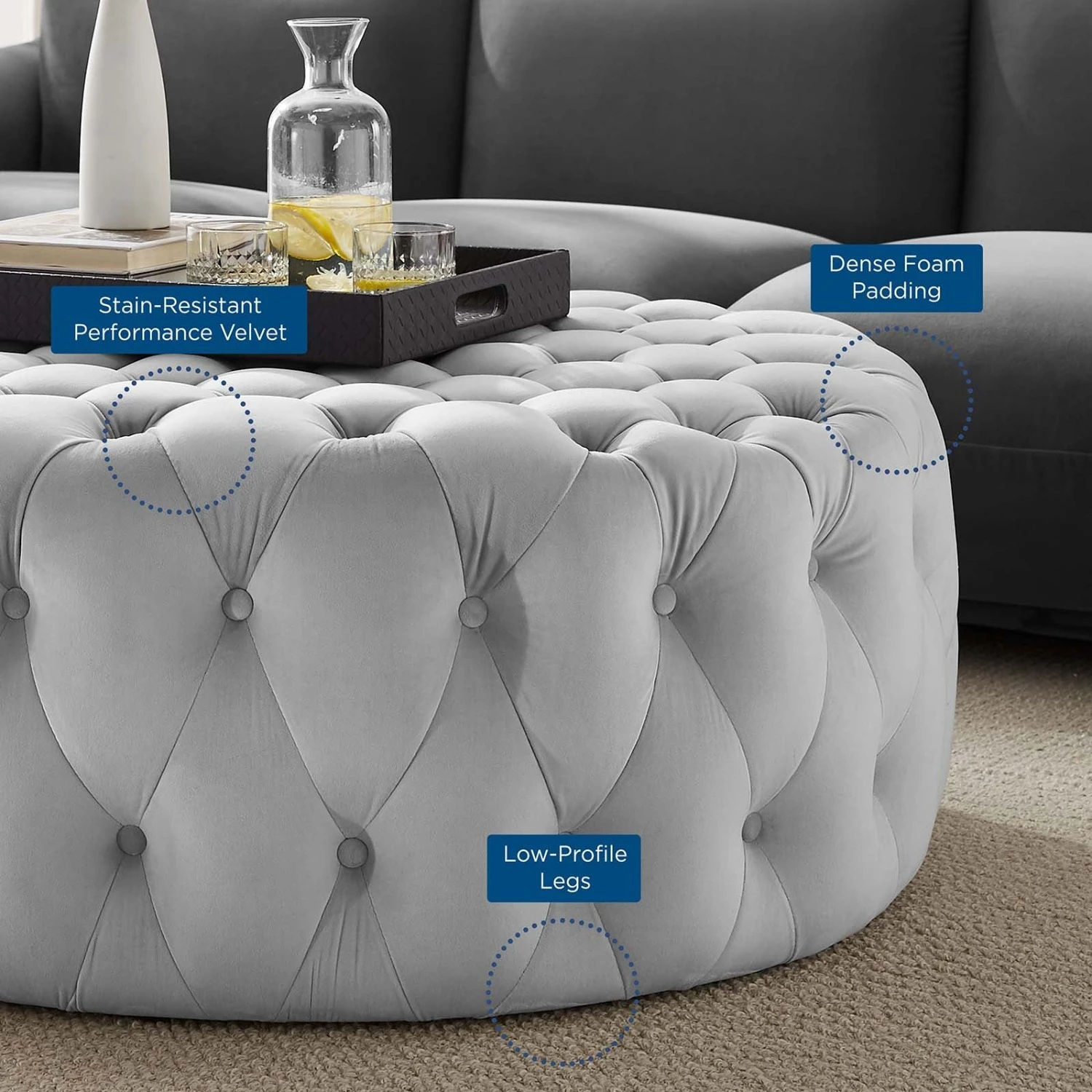 • This large button tufted round ottoman comes upholstered in soft and durable stain-resistant performance velvet fabric with dense foam padding for a luxurious seating experience.