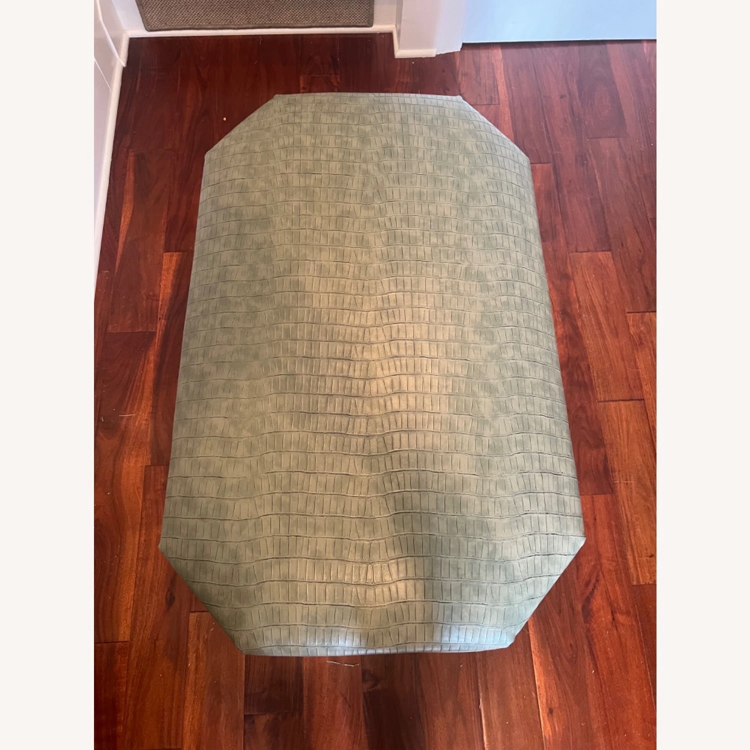 Seller’s Notes: Light green leather (textured) ottoman in pristine condition.