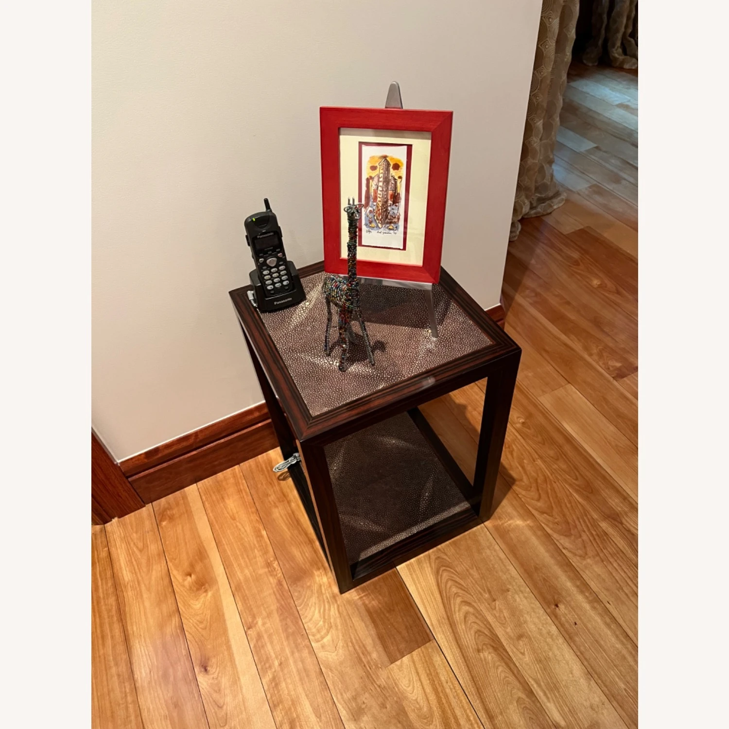 Seller’s Notes: Macassar Ebony End Table in Dark Brown Shagreen Top and Base. Purchased in 2008, still in great condition. Original receipts available for perusal.