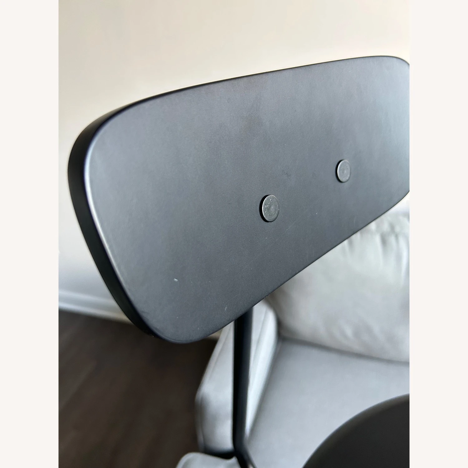 The base is made of bended and welded steel tubes. The base has a powder coated finish. The seat is milled MDF with a painted finish. The upholstered seat is made on plywood upholstery shell, foam and upholstery. The walnut back restis made of curved walnut veneer.