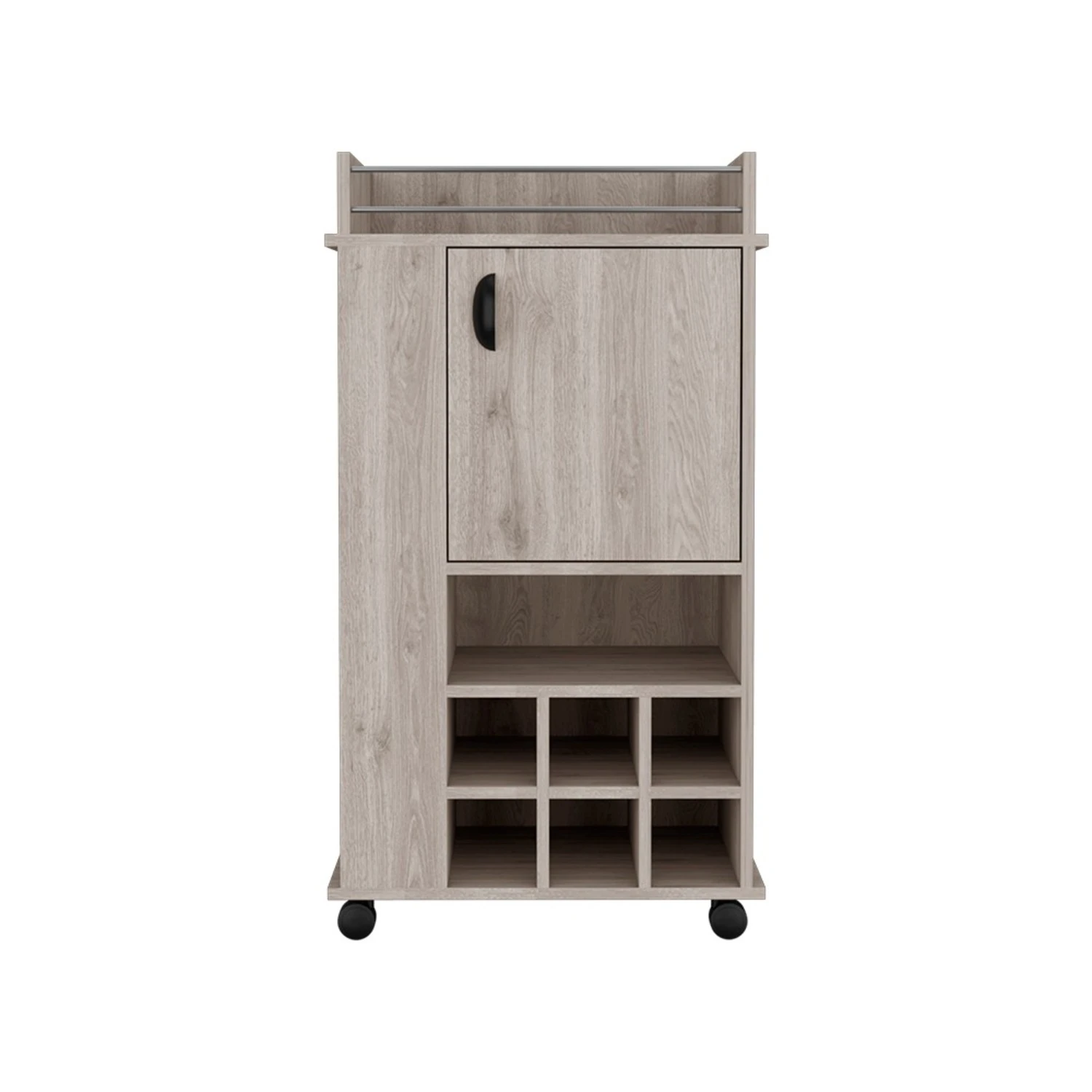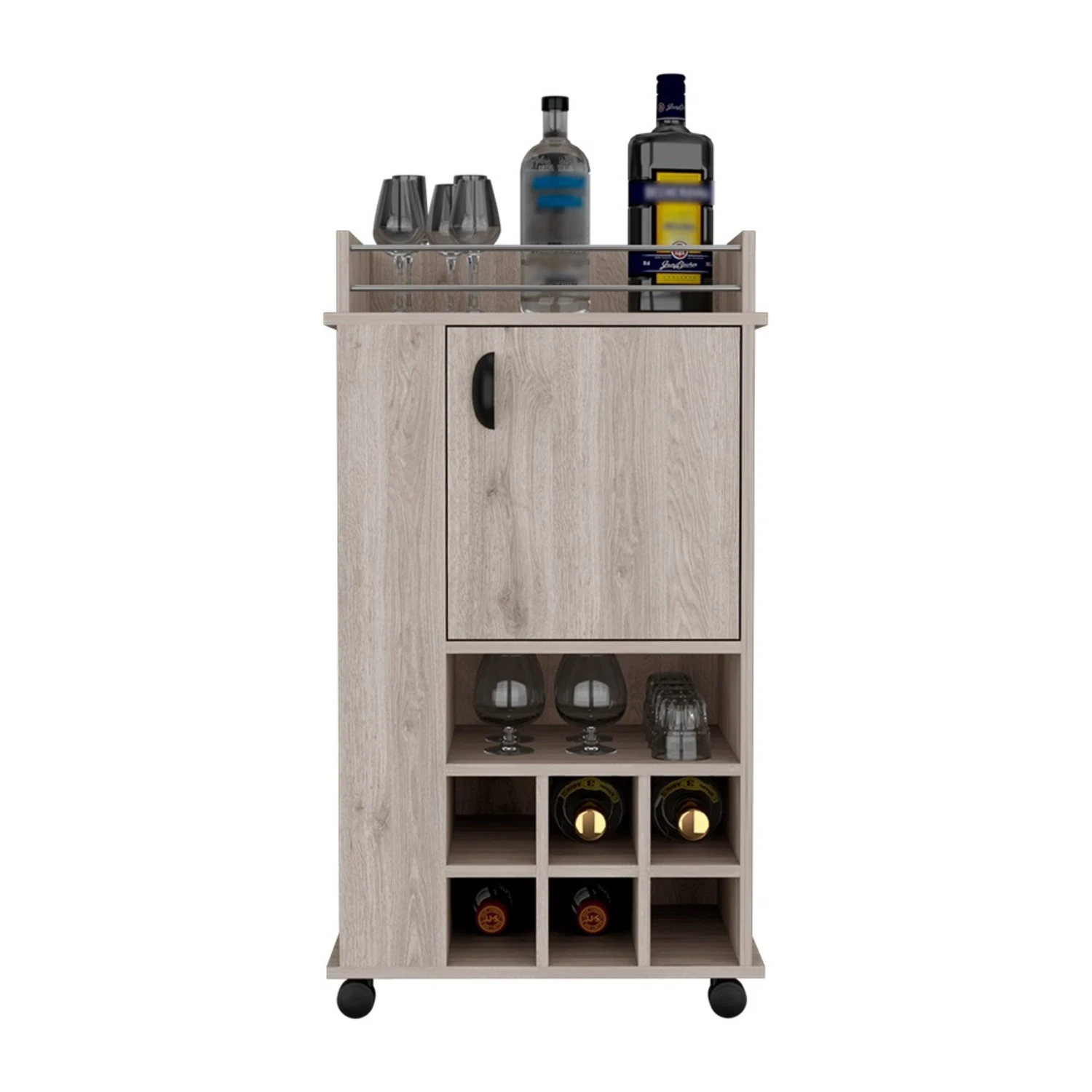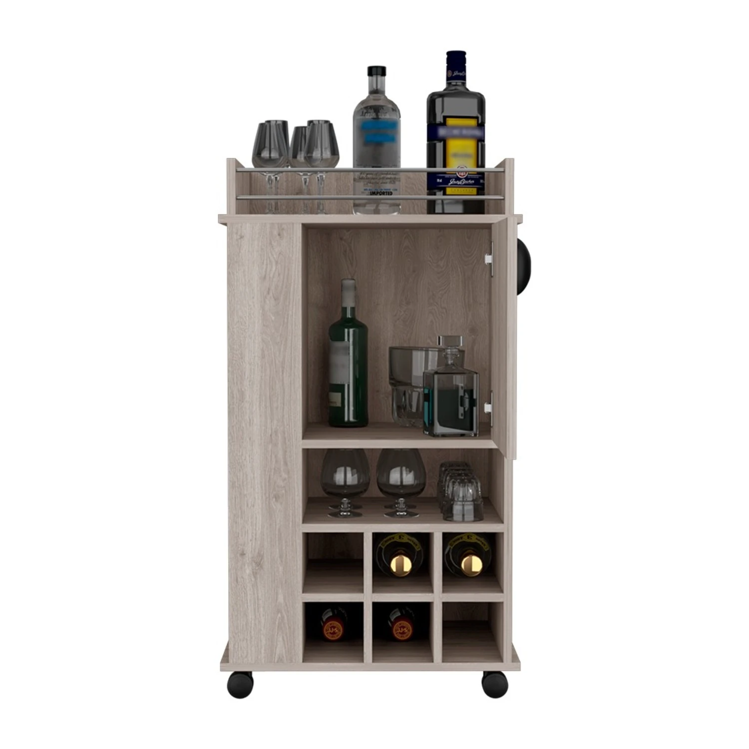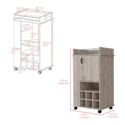 Featuring a single-door cabinet with a sleek handle, the Reese Bar Cart conceals an organized interior with ample storage space, an open storage cabinet, and six-bottle cubbies (4.4″”) to house your favorite wines and spirits. For even more storage capacity, the side of the bar cart includes two open shelves, offering the perfect spot for extra glassware, mixers, or decorative items.
