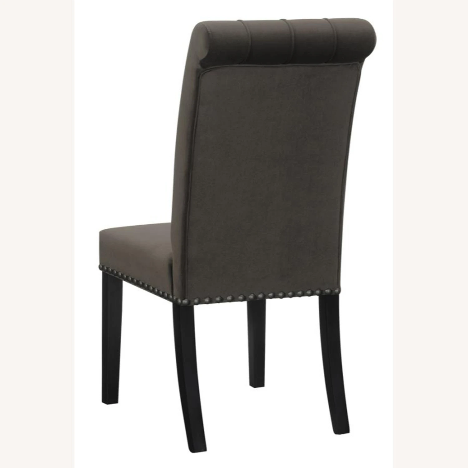 • For a lighter look, plushily padded side chairs are adorned with rolled backs and button-tufted upholstery with bold nailhead trim