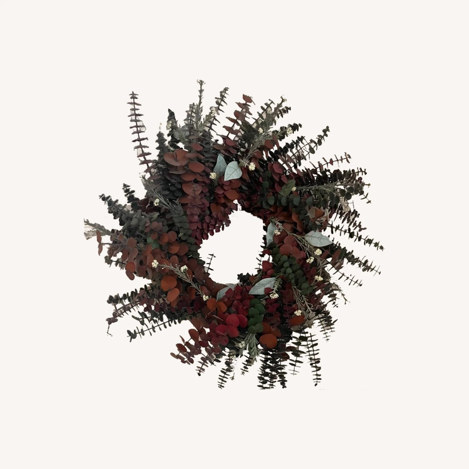 Seller’s Notes: Very nice faux foliage wreath. Primarily eucalyptus with additional foliage variation. Embedded fairy lights with 3 settings (On/Off/Timer) Unique and well-built on a solid metal frame. Light and easy to transport from upper Manhattan one block from the C (Save us both some money and just pick it up yourself). Quite sturdy – a nice imitation piece that will last a very long time with minimal care.