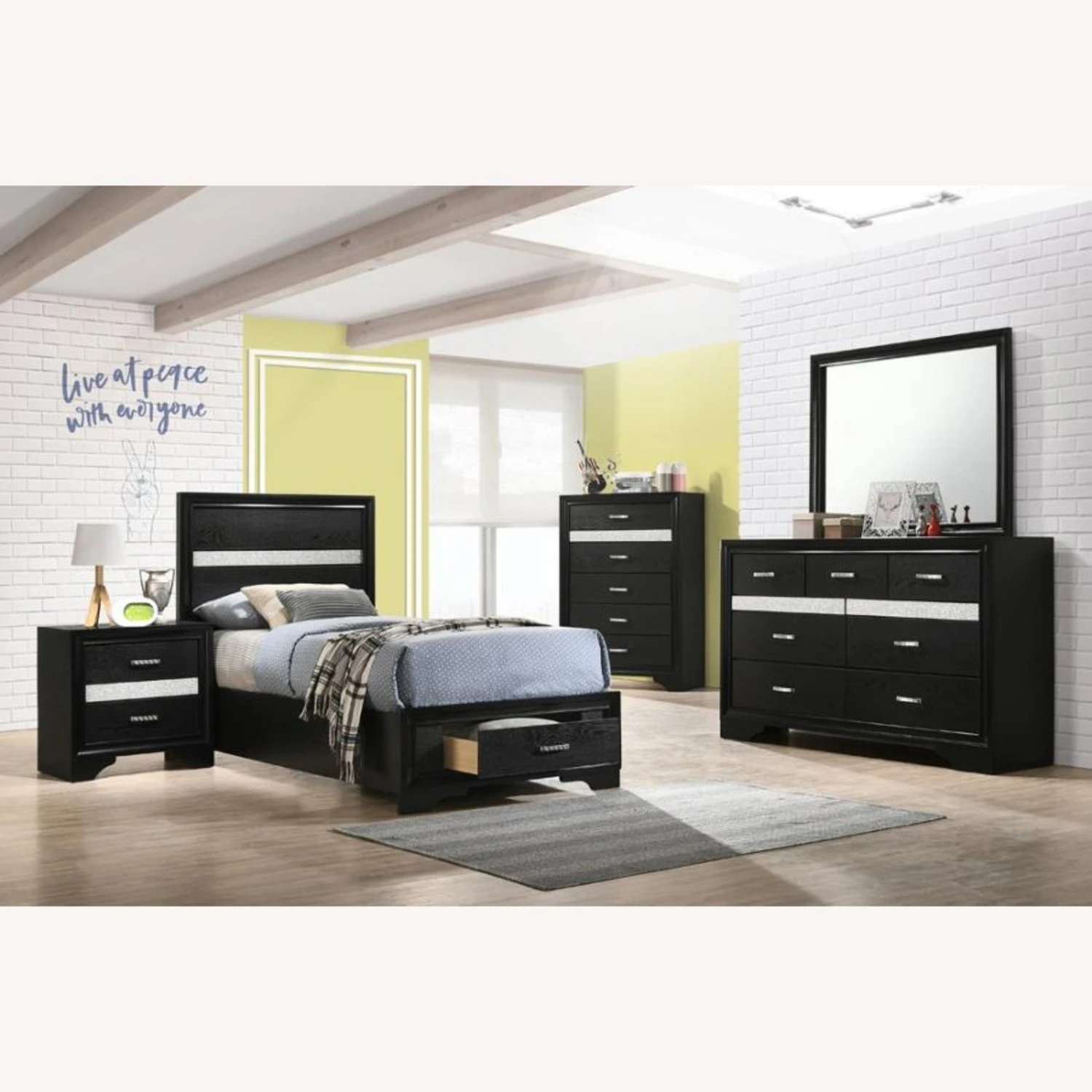 • Bed features storage in the footboard and is fully slatted