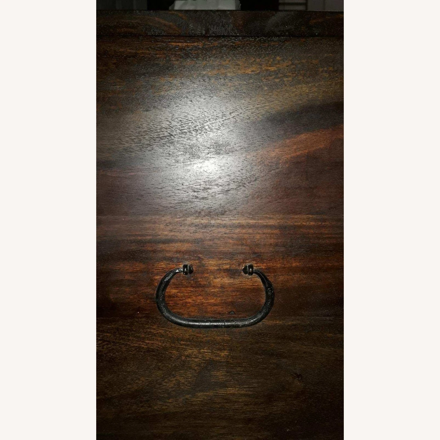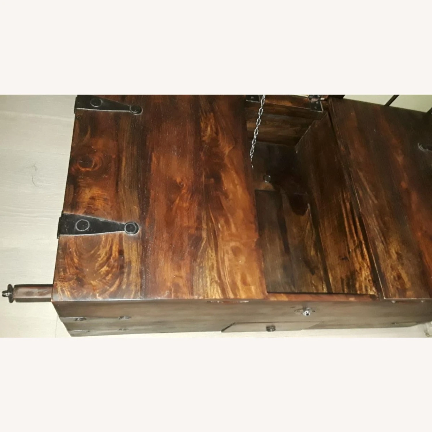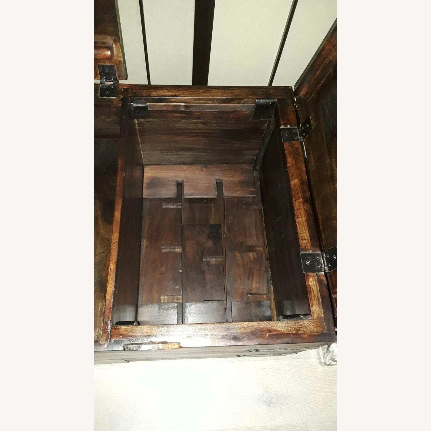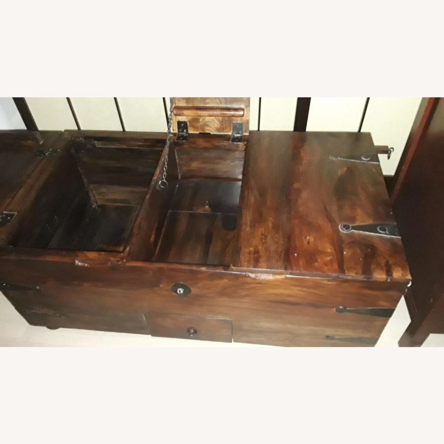 Seller’s Notes: This beautiful antique-style storage chest will make a striking decorative addition to any room, also has ample space for keeping a wide range of items like clothes, magazines and books organized and out of sight. Perfect also for the entryway or act as wood end of bed. Even better as a casually cool coffee table. This craftsmanship is 3 parts, both ends are 16” wide, center is 11” wide (with latch). One compartment can be used for wine storage, having detachable wooden racks, (see photo). Dimensions: 43″ (3 parts: 16″x11″x16″) x 24″ x 18″ (L x W x H) The unit is well made and the closing mechanism on the storage lids is real strong and sit on 4 wooden shaped round balls, underneath is easily cleaned by swifter. On both ends are 2 pullouts to hold the lids if you need both hands to put something in or take out. The center has a chain to hold the lid up. The trunk is portable having two side handles (see photo). The mishap are there are 2 small chips off the old block on the left side edges (see photo). No assembly required.