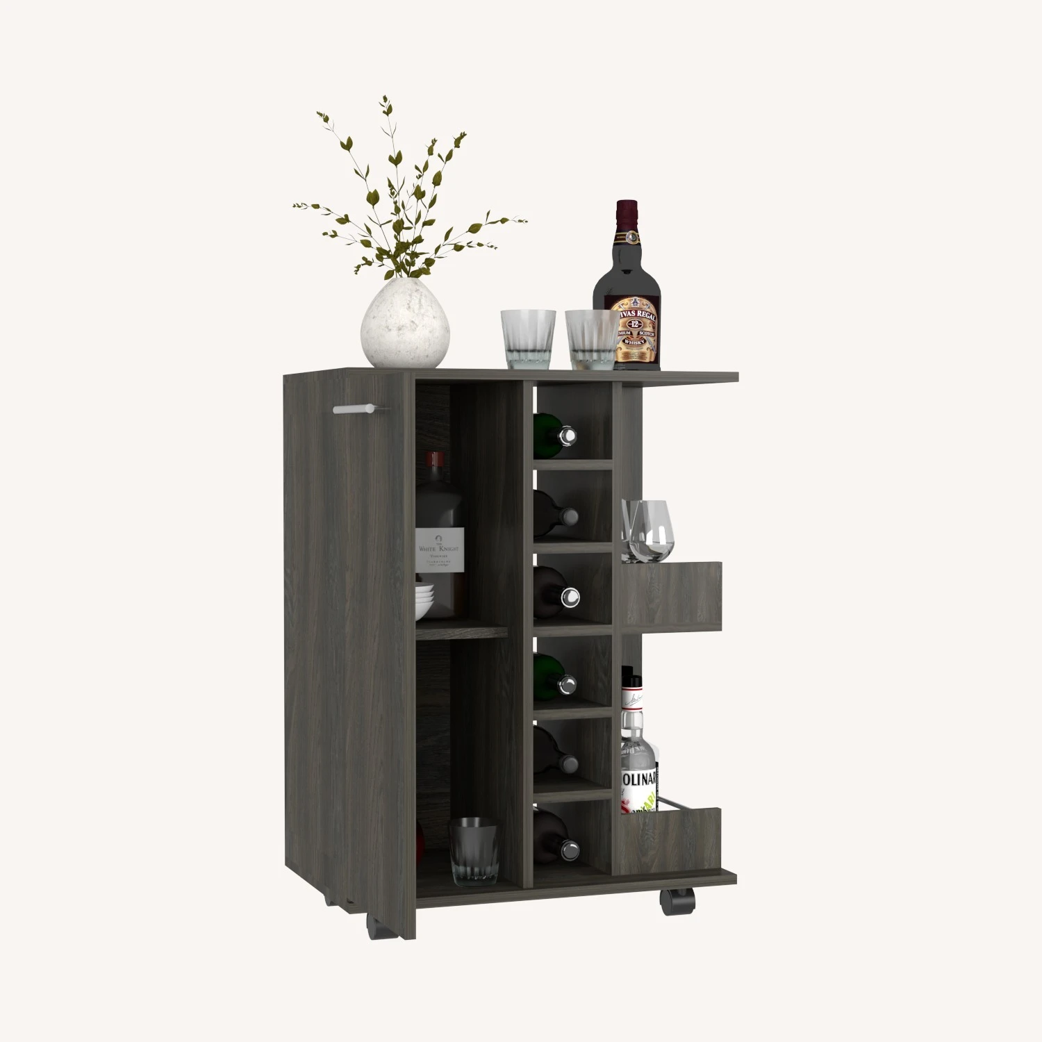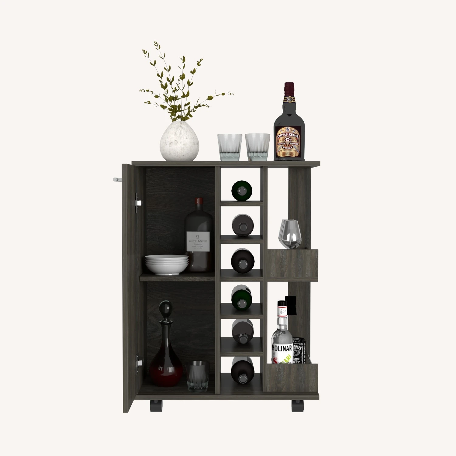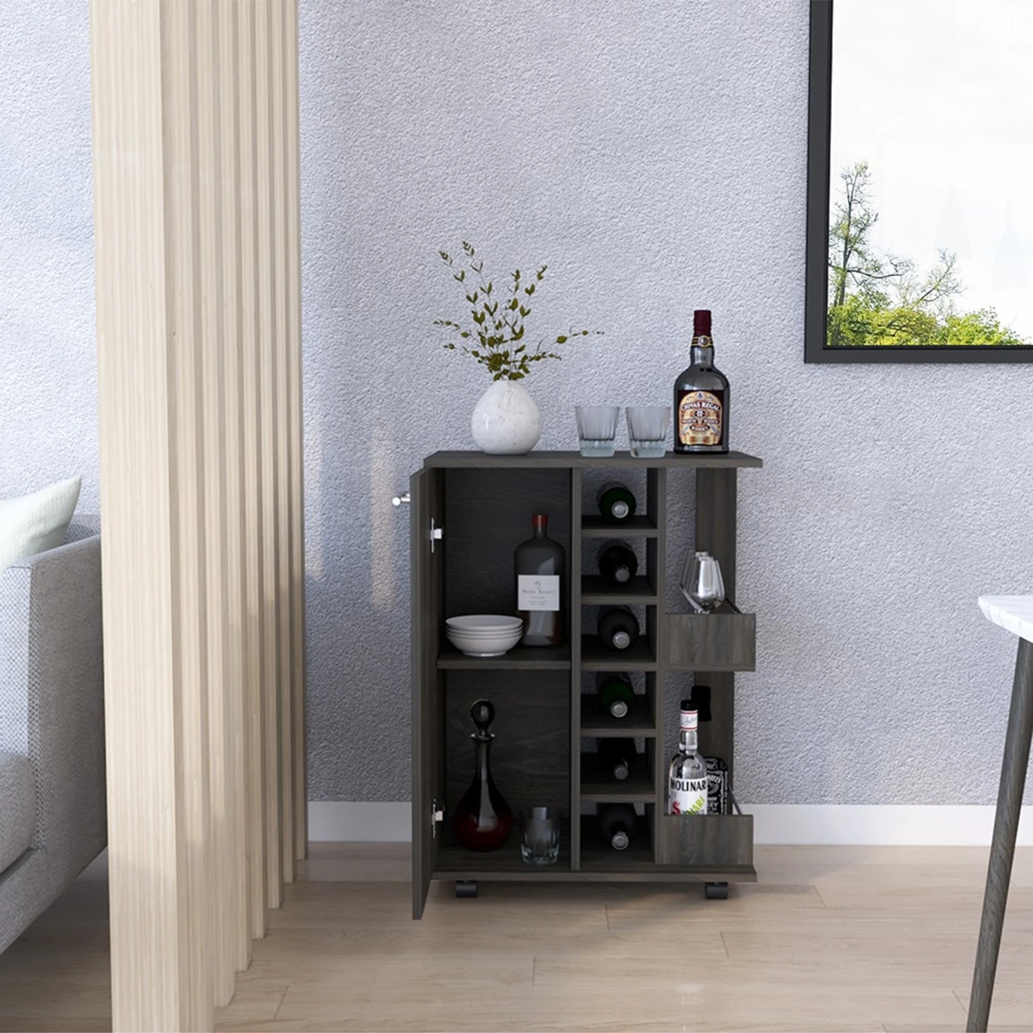 Seller’s Notes: “The Wells Bar Cart brings mobility and functionality together. The smooth open-top counter is perfect for placing cocktails during a function or showcasing decor any other day of the week. It’s a modern stylish piece that gives your space a touch of sophistication. Featuring a spacious cabinet with two enclosed shelves, two open liquor bottle shelves with rail guards, six liquor bottle cubbies, and casters with a locking system. Designed with Carbon Espresso manufactured wood.