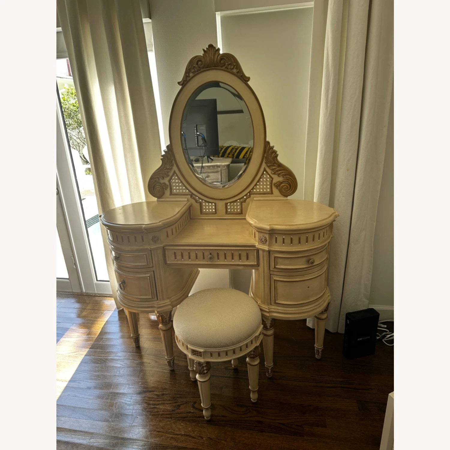 Seller’s Notes: creamy Joliette finished Pulaski Vanity & Stool. Done in a French style with tapered legs and antique finish pulls on the drawers. Measures 48*18*36.