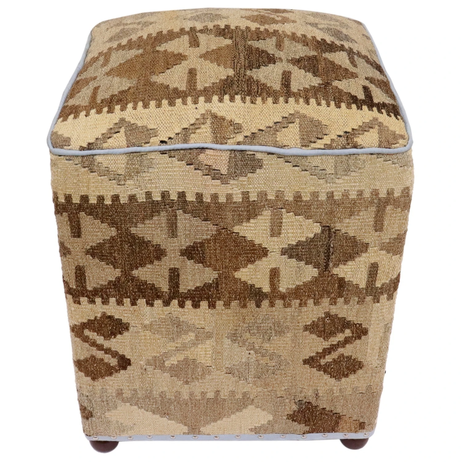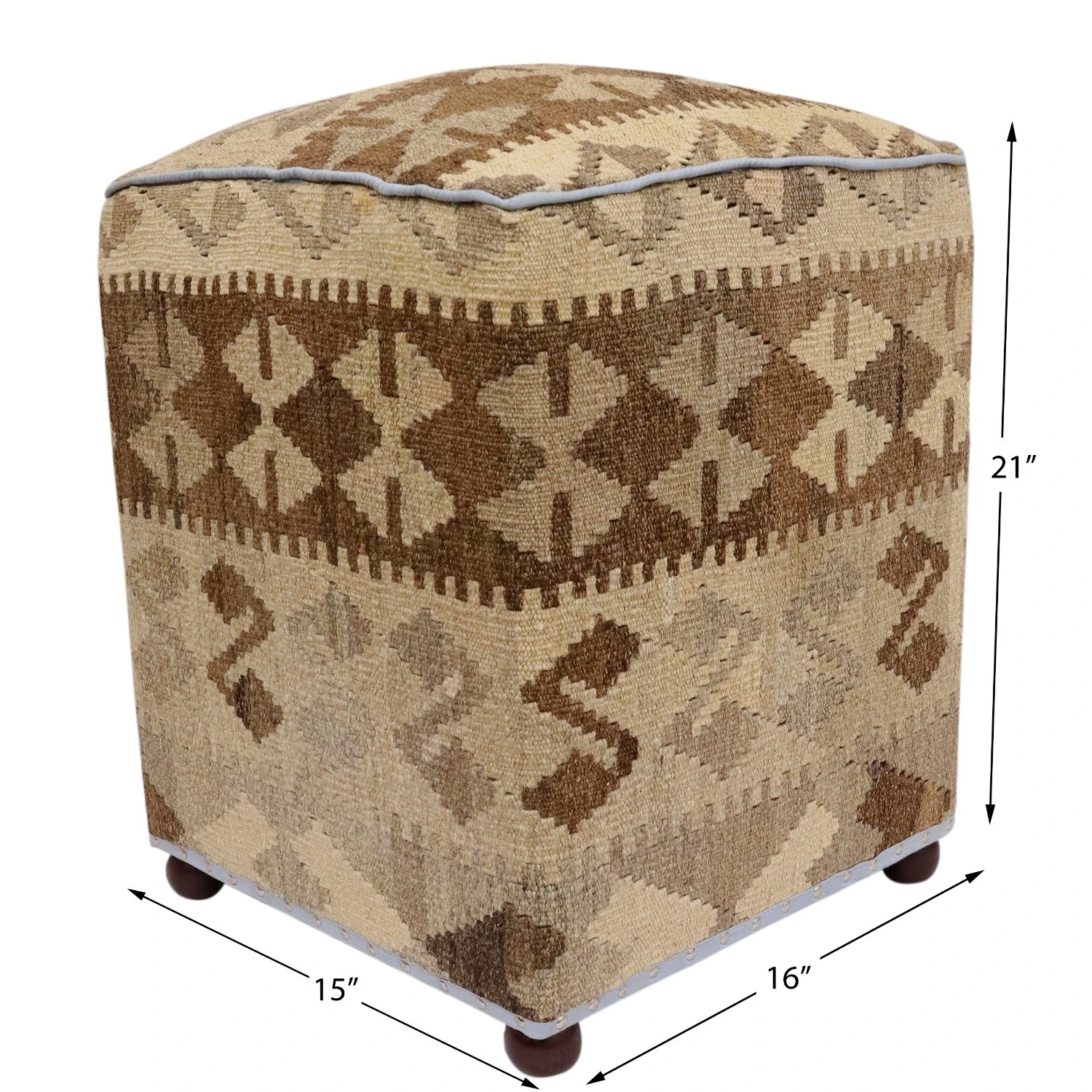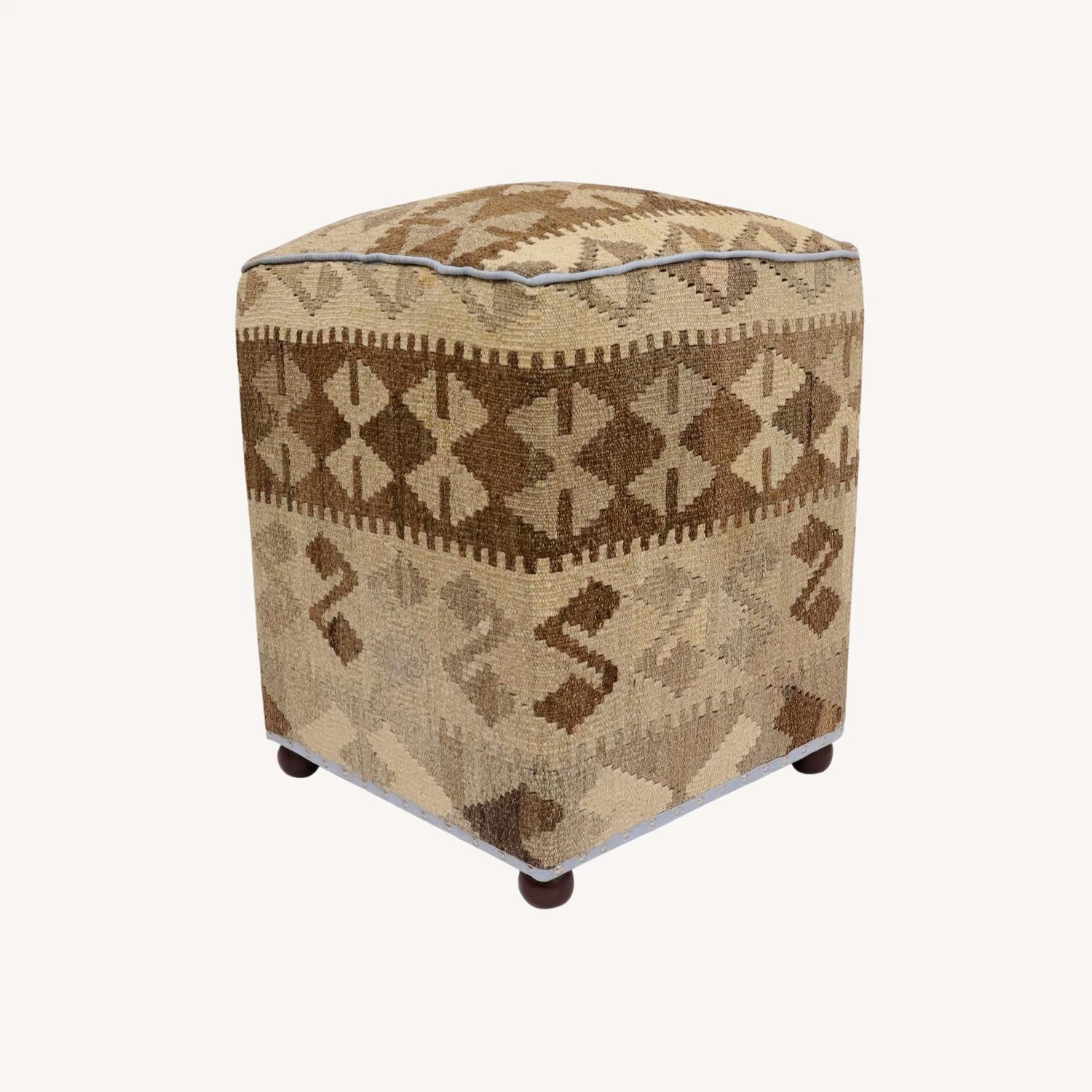 Seller’s Notes: Chic handmade ottoman crafted using wood and upholstered using hand-woven kilim wool rug is a multi-purpose fashion pouf which will add dimension, color and style to your decor. Inspired by geometric motifs in any array of effervescent color pallet grounds any space with elegance and sophistication.