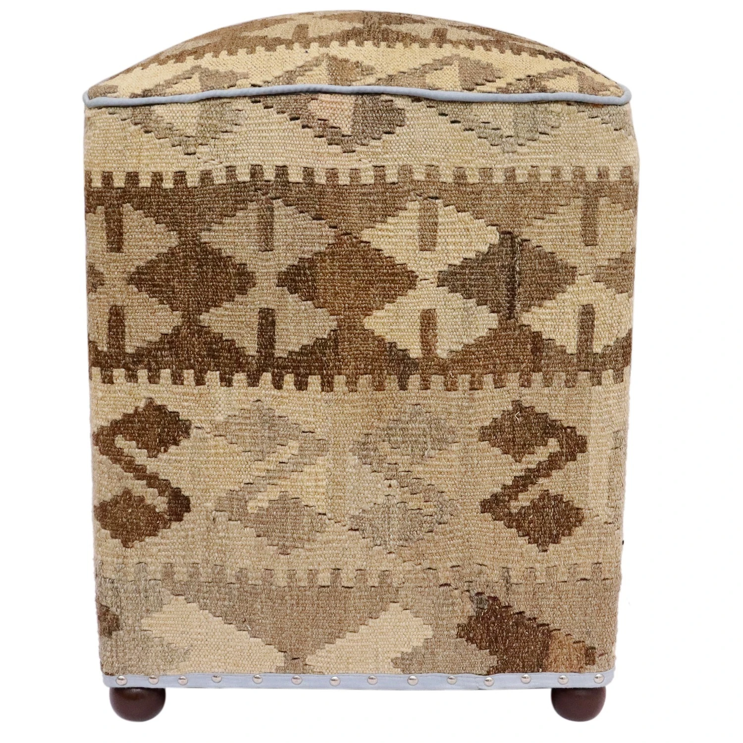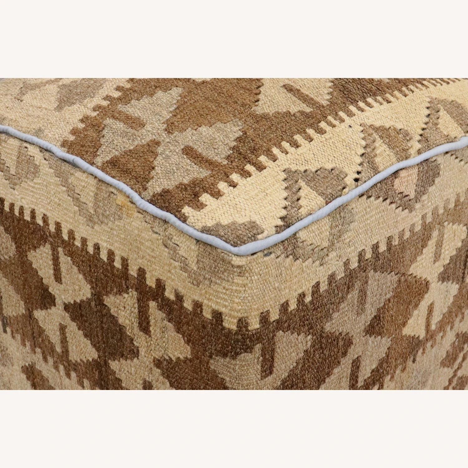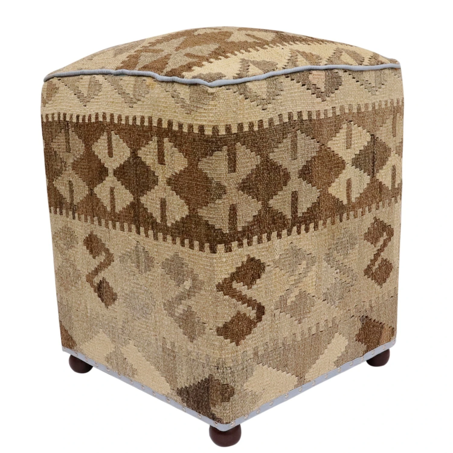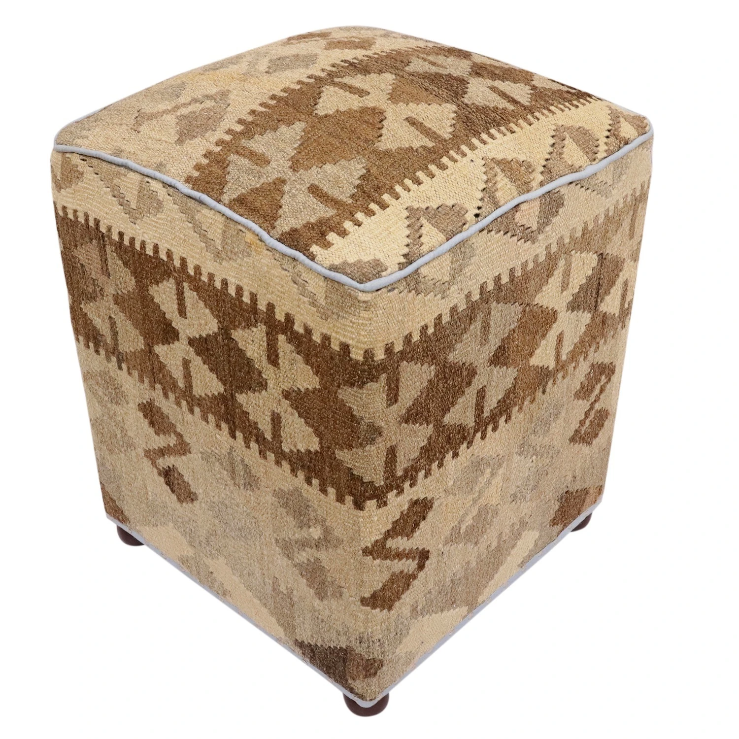 Seller’s Notes: Chic handmade ottoman crafted using wood and upholstered using hand-woven kilim wool rug is a multi-purpose fashion pouf which will add dimension, color and style to your decor. Inspired by geometric motifs in any array of effervescent color pallet grounds any space with elegance and sophistication.