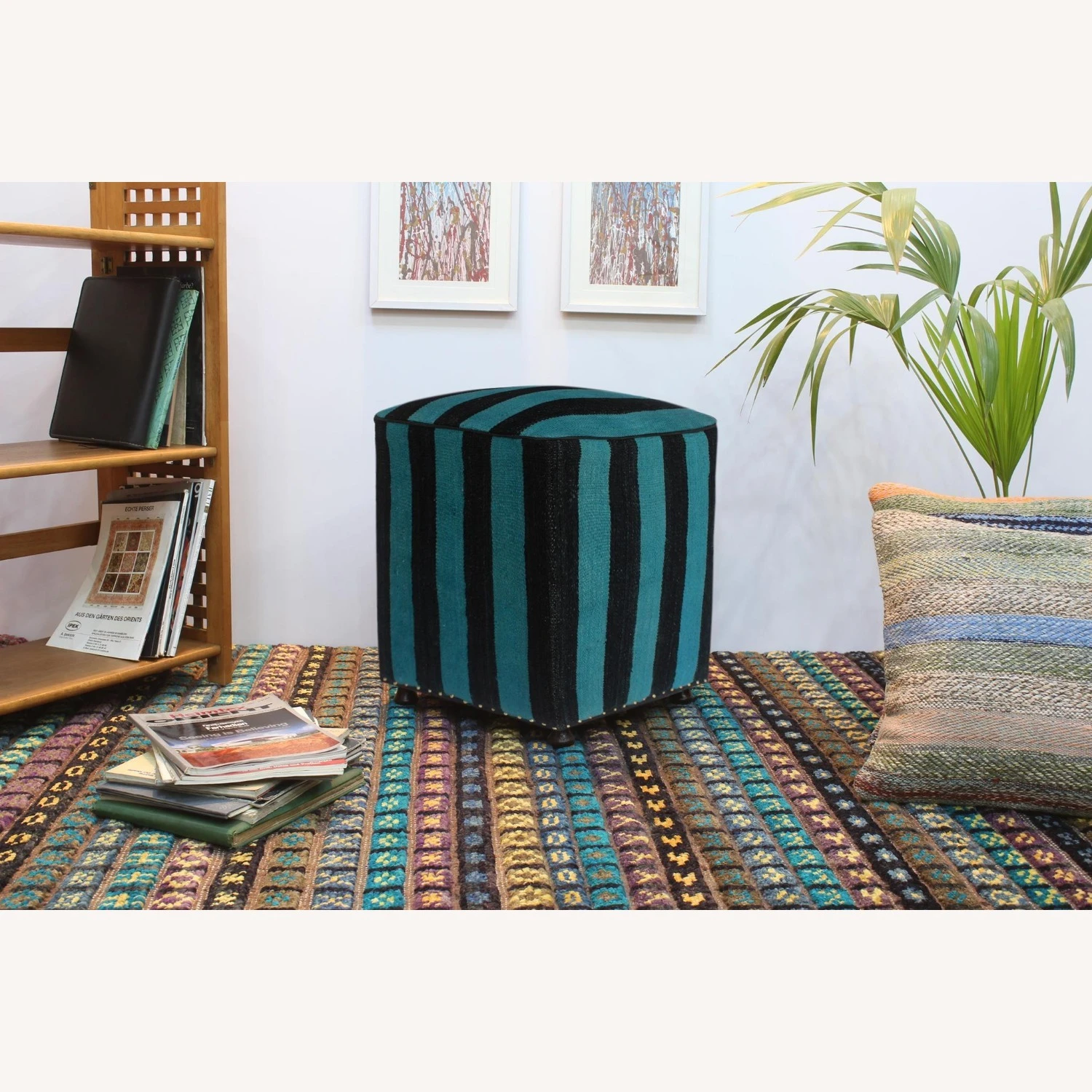 Seller’s Notes: “Chic handmade ottoman crafted using wood and upholstered using hand-woven kilim wool rug is a multi-purpose fashion pouf which will add dimension, color and style to your decor. Inspired by geometric motifs in any array of effervescent color pallet grounds any space with elegance and sophistication.<p><br></p>