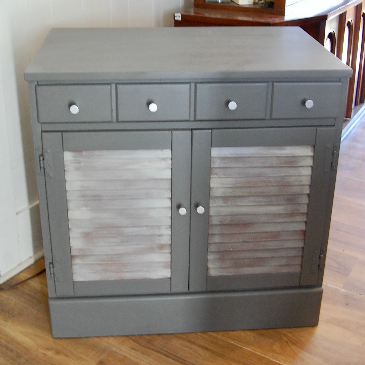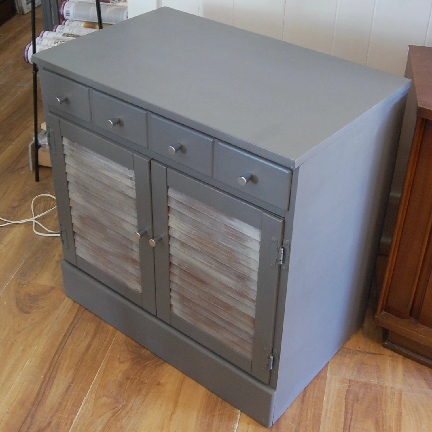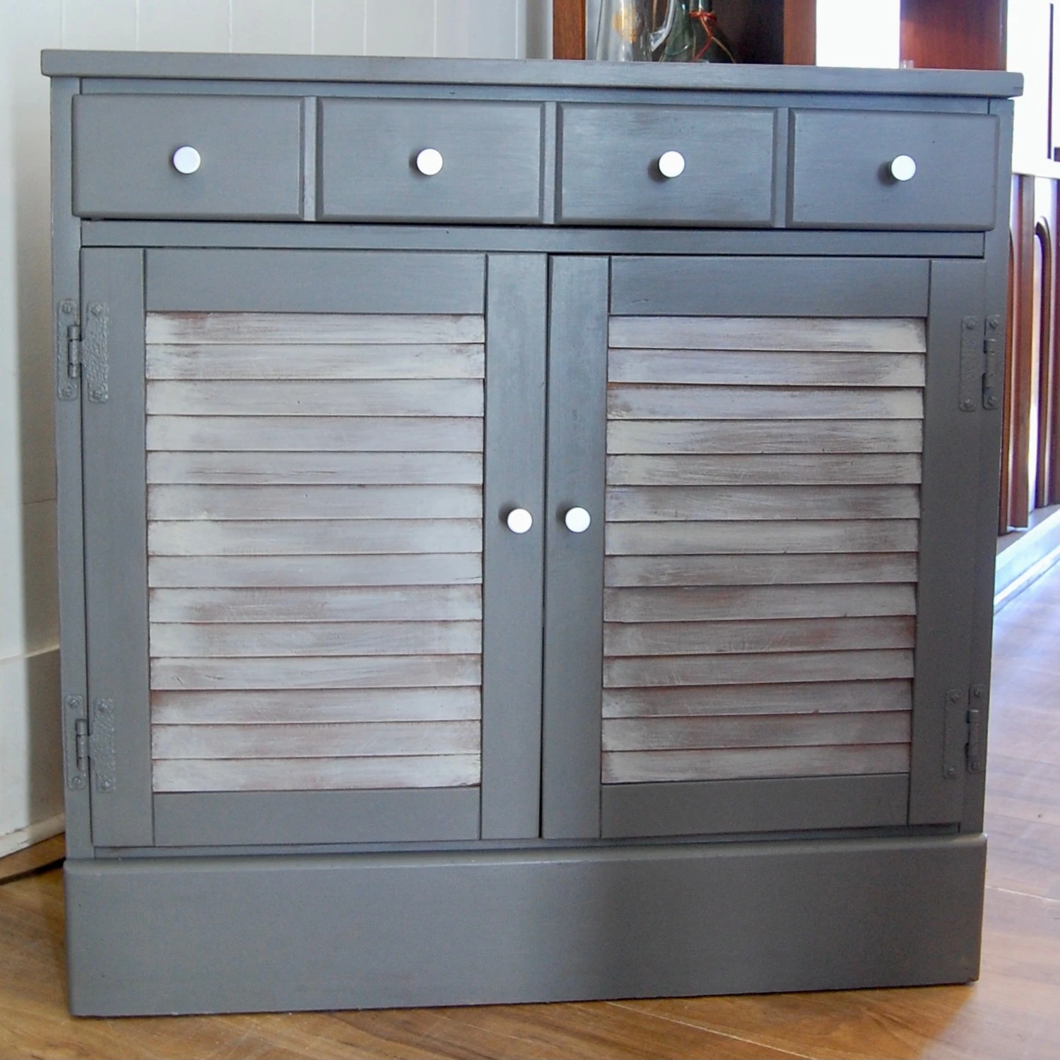 Seller’s Notes: Small 1970’s retro cabinet. This piece has beed updated with new gray finish. The louvered cabinet doors have been painted to yield a driftwood like finish. Features a drawer at above the cabinet doors. New cabinet door and drawer pulls have been installed. The interior of the cabinet space features one full width, full depth shelf in its original brown painted finish. Perfect for anywhere you need some storage! in a kitchen, pantry, entry hall, closet organizer, bath or even you bedroom!
